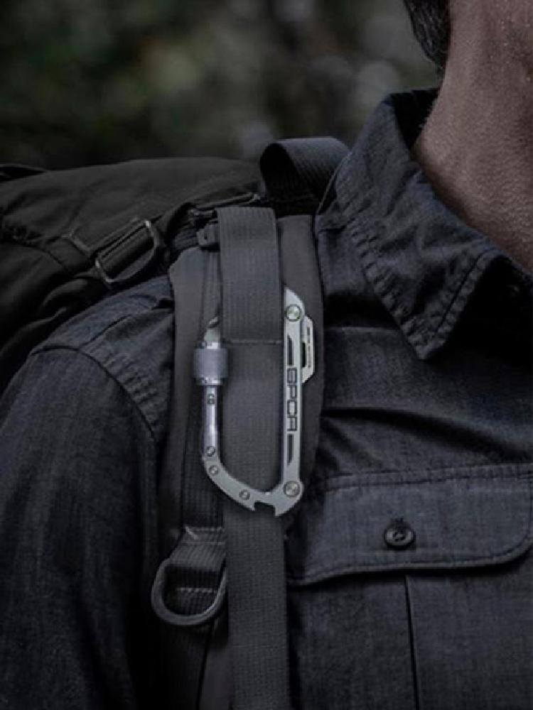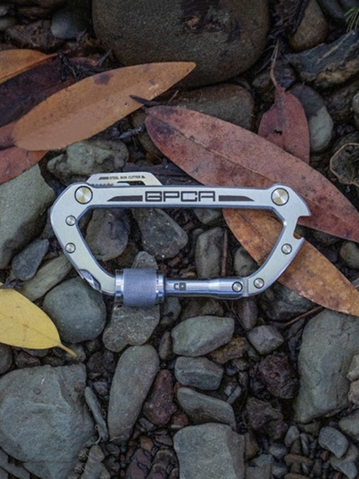 便携实用,快挂锁扣,户外出行使用非常方便。上面隐形的小刀设计,可以作为多种用途使用,比如割绳子切水果等。登山扣的设计,上面多个螺丝钉,凸显机械特色,非常具有质感。