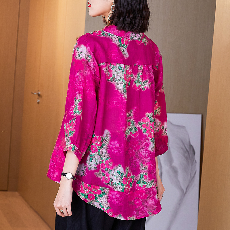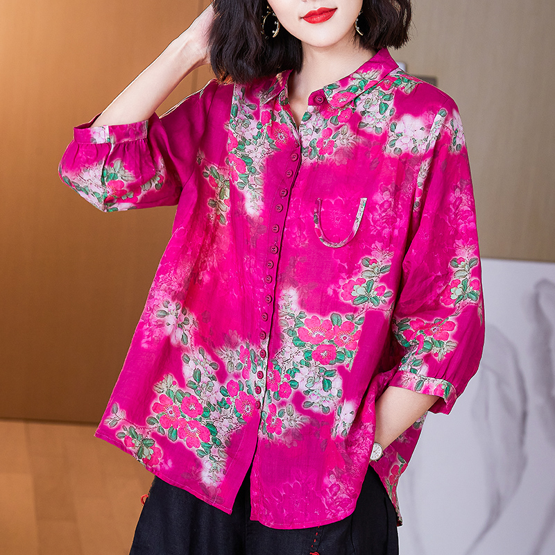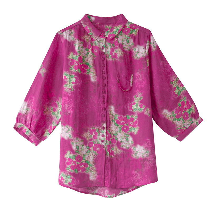 棉麻面料的衬衫,宽松的版型,穿着舒适自在,清新的印花,文艺范十足。