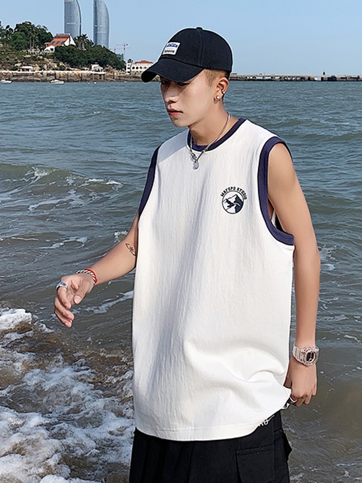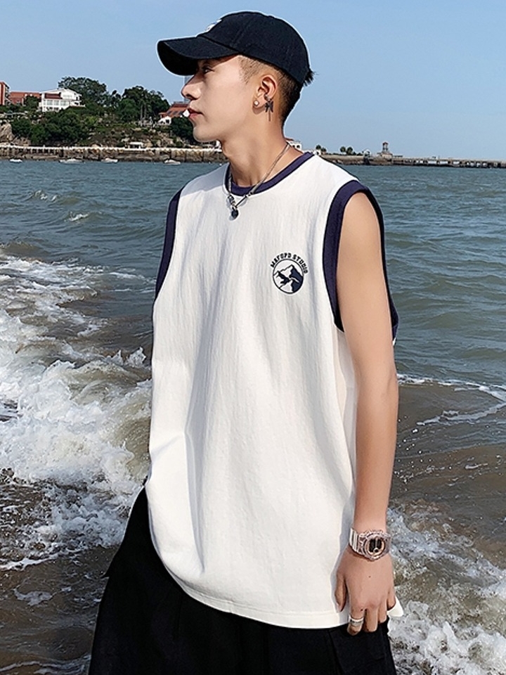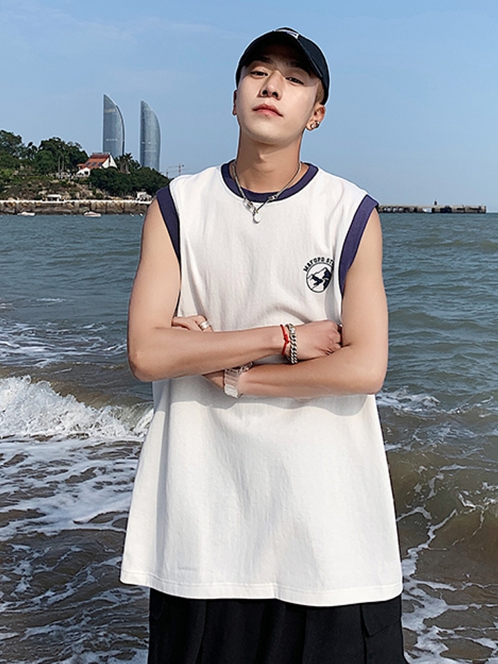 撞色圆领的设计修饰脸型拉长颈部的线条,无袖的裁剪显出手臂和肩部的线条,胸前的印花图案增添了设计感,不那么单调了。