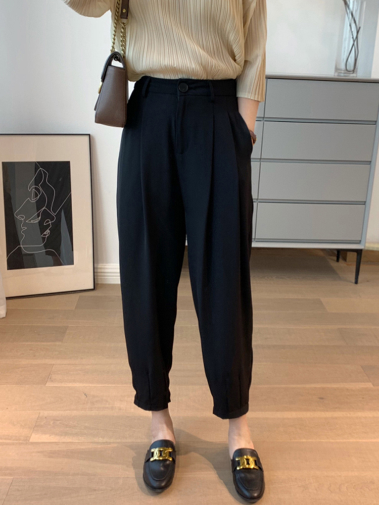 束脚哈伦裤版型,呼应运动风潮,释放年轻活力;配以连帽卫衣、浅色板鞋,轻松营造青春的动感活力;亦可与T恤、衬衫等上衣混搭,时髦百搭。