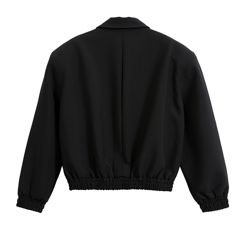 宽松版型,穿着舒适自在,垫肩设计,修饰肩部线条,短款外套,拉长身材比例,经典复古风格,时尚百搭。