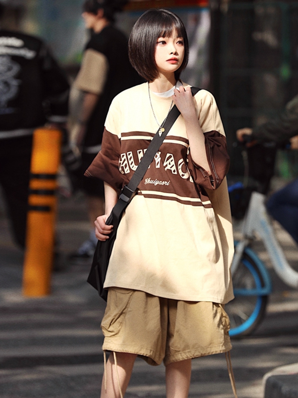 圆领设计简约大气,还能修饰脸型拉长颈部的线条,衣身的字母印花图案增添了趣味感,使衣服看上去不那么单调啦。