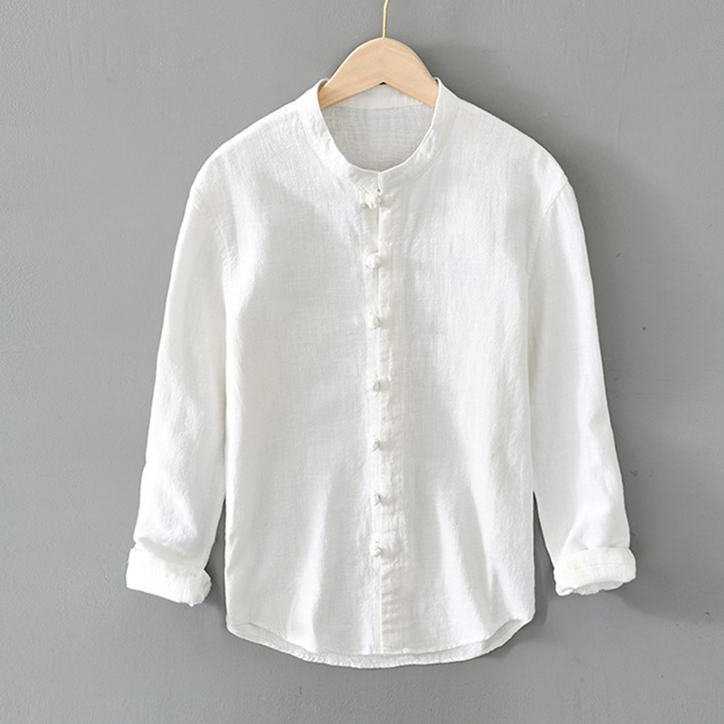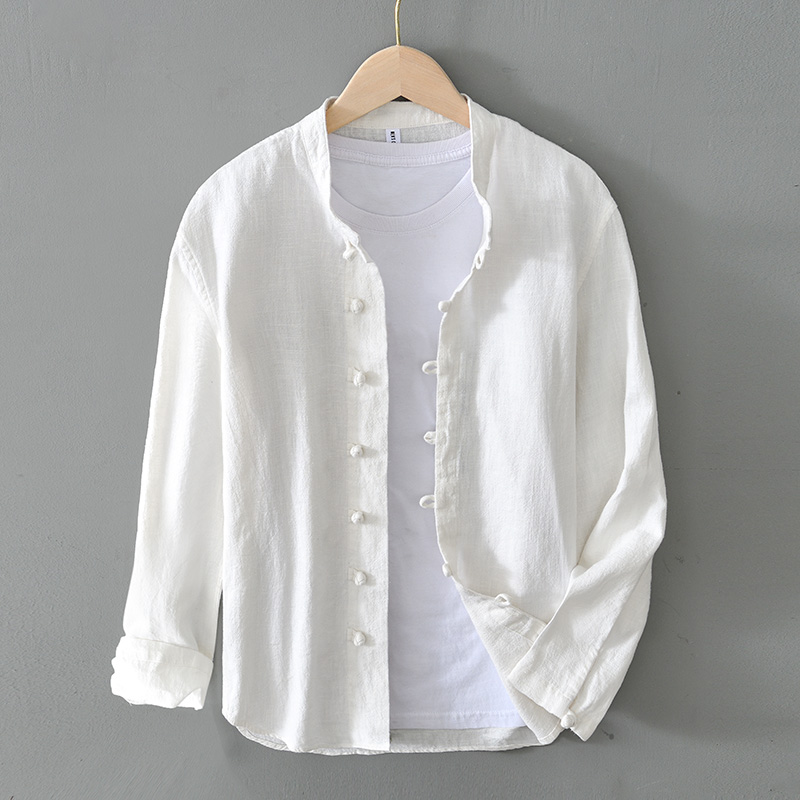 这款衬衫采用了亚麻面料,手感柔软,穿着舒适,透气性好,搭配上复古的盘扣设计。