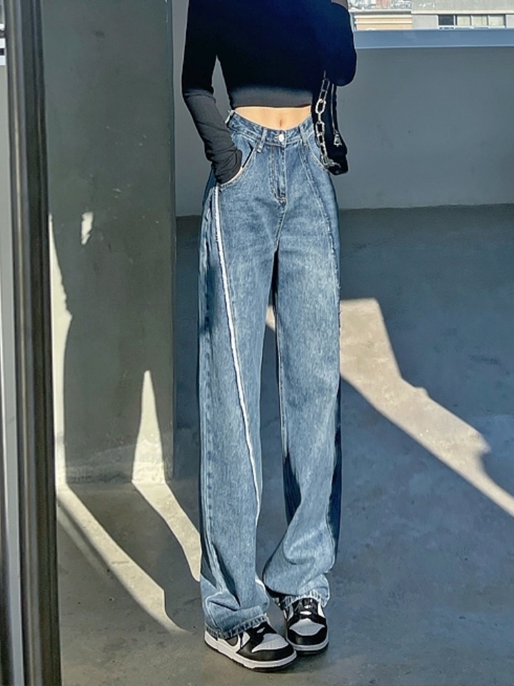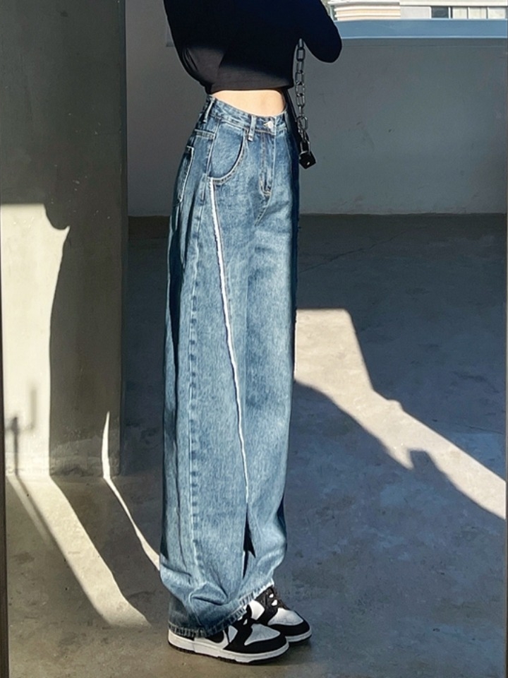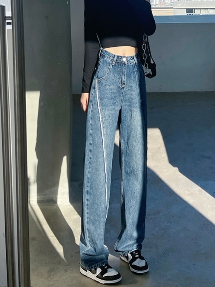 高腰设计,拉长身材比例。高腰牛仔裤,显瘦显腿长。直筒裤型,修饰腿部线条。