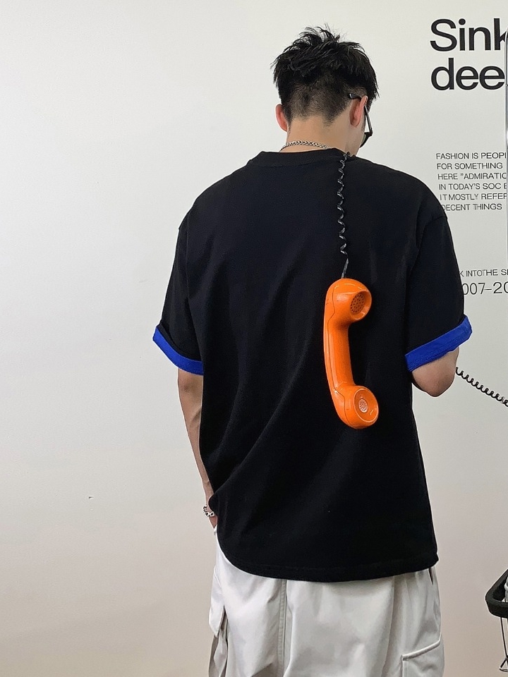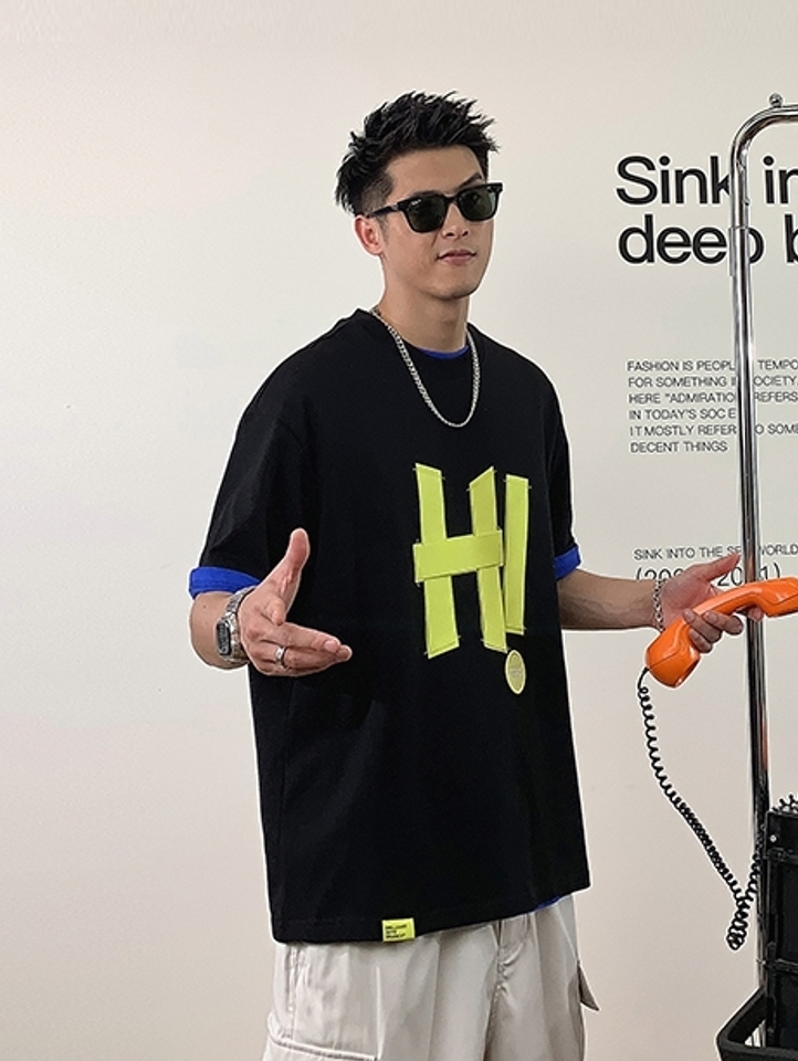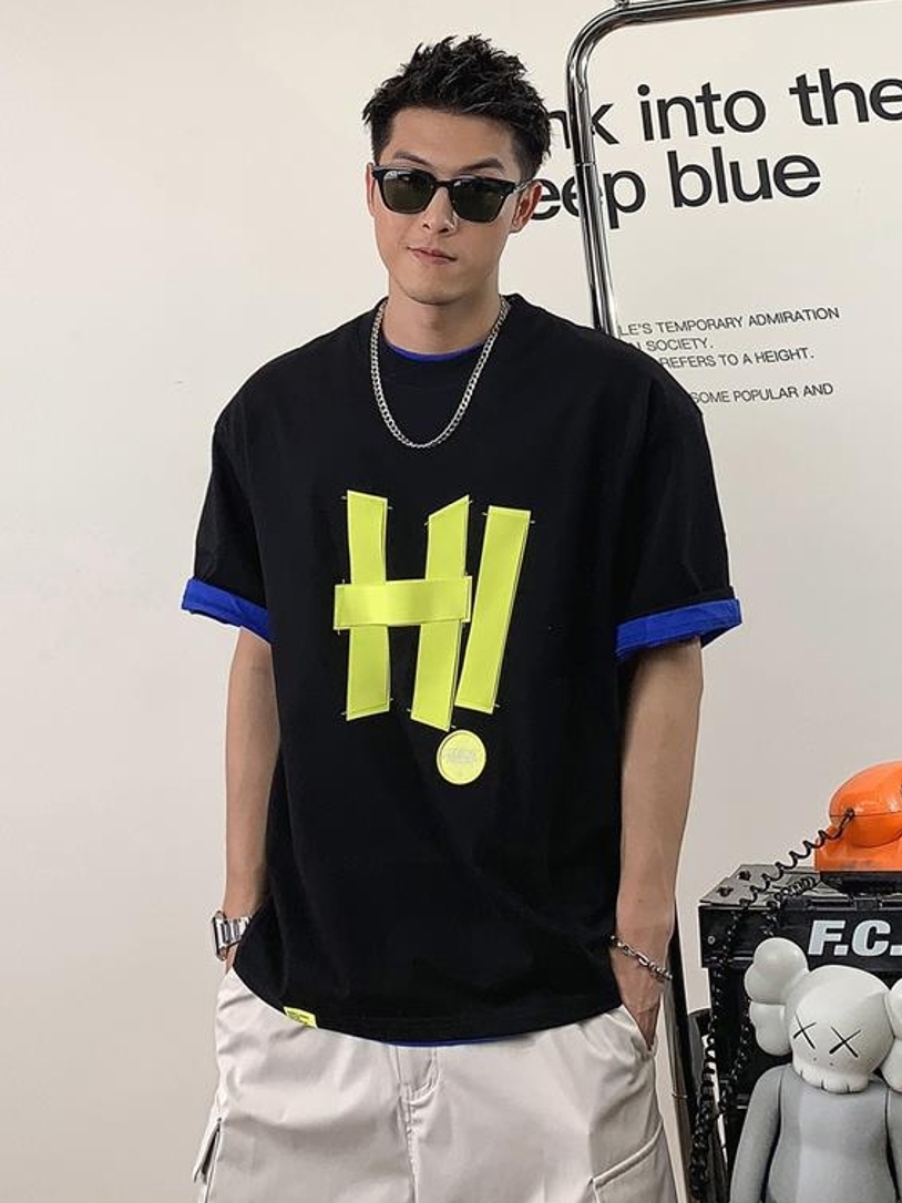 胸口上面超大的黄色字母印花,给人眼前一亮的感觉,吸睛效果超赞,同时还打破了单一感,袖口上面蓝色的撞色拼接,增添了衣身的层次感。