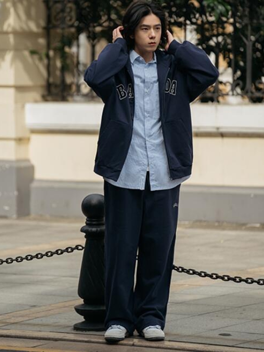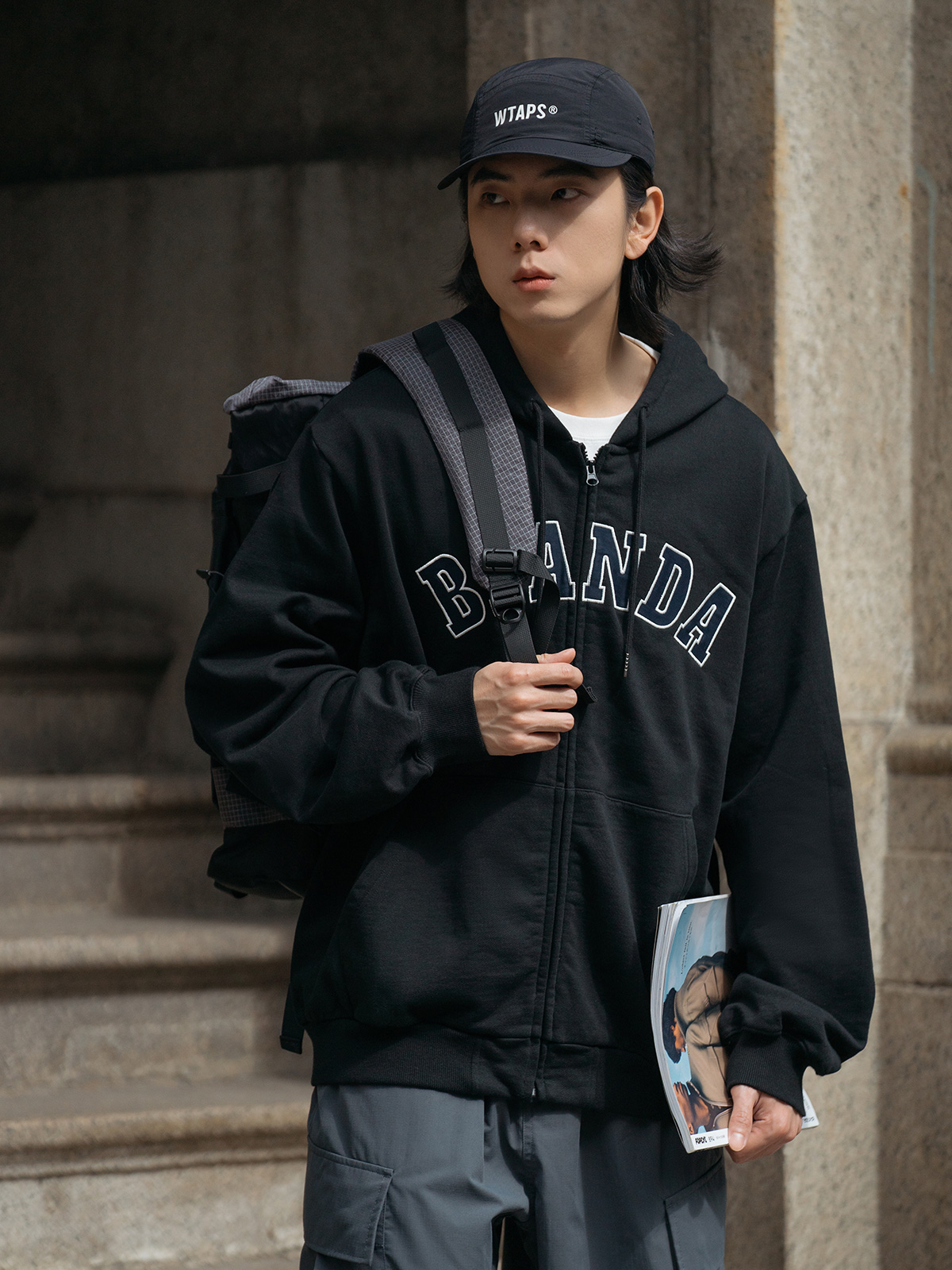 日系休闲风的开衫卫衣,面布扎实,纹路清晰。落肩设计让肩膀和手臂具有良好的活动性,衣身剪裁适中有利于露出里层衣服,营造层次感。