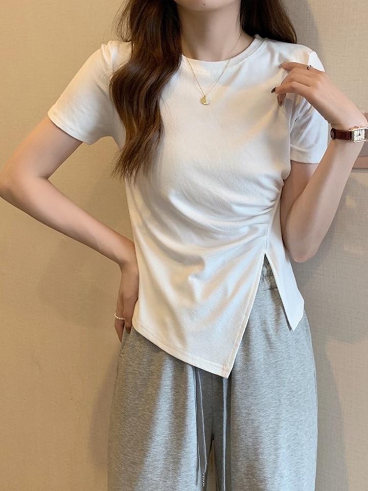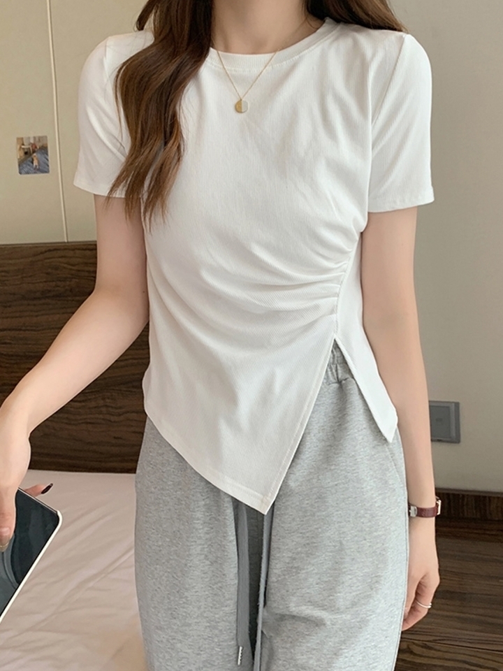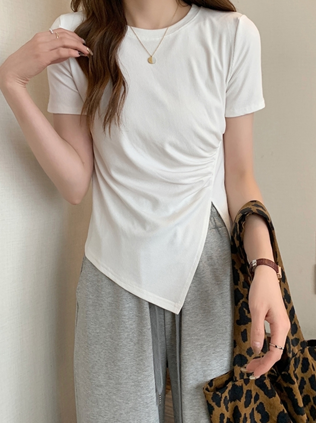 基本款的圆领Tee, 不规则衣摆设计, 个性时尚。流畅的线条设计,给人一种优雅舒畅的感觉。