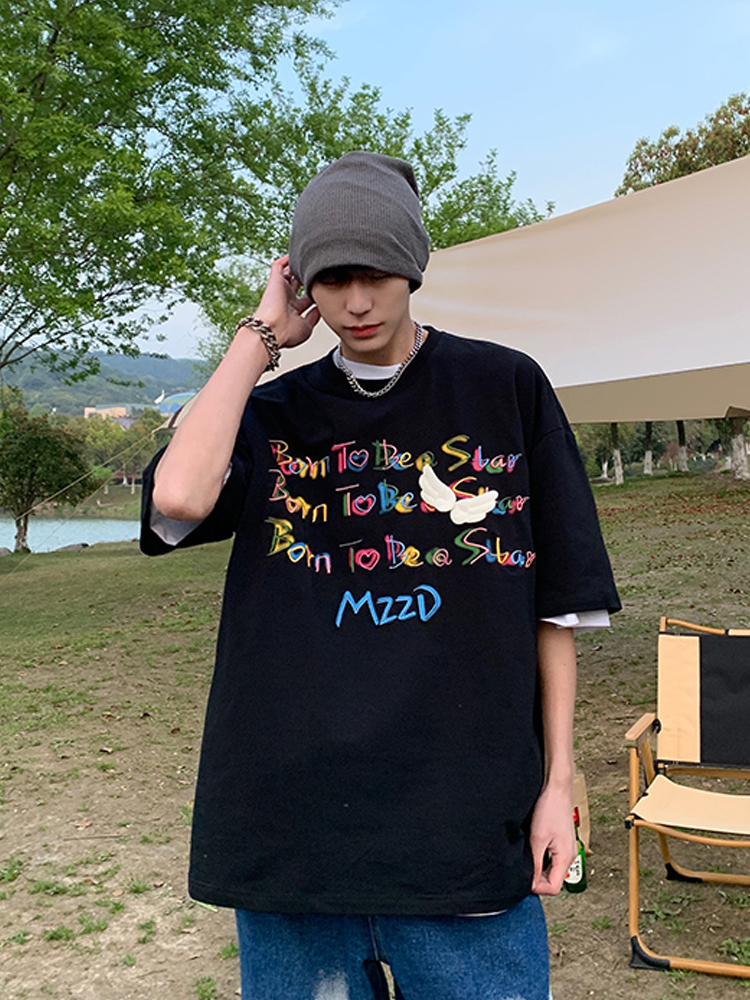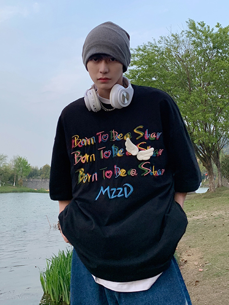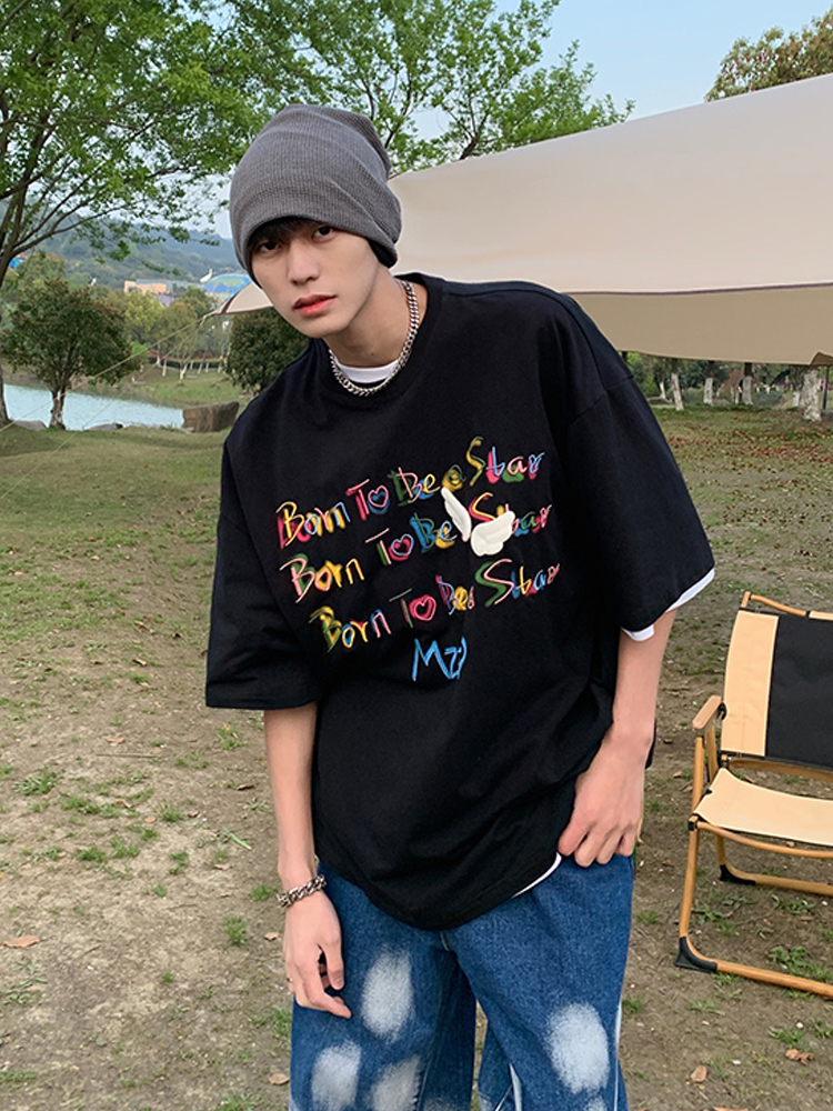 简约时尚的黑色T恤,清新感十足的黑色调,十分百搭。大大的圆领设计,搭配胸前字母贴布修饰点缀,简单而不失街头范休闲感十足。