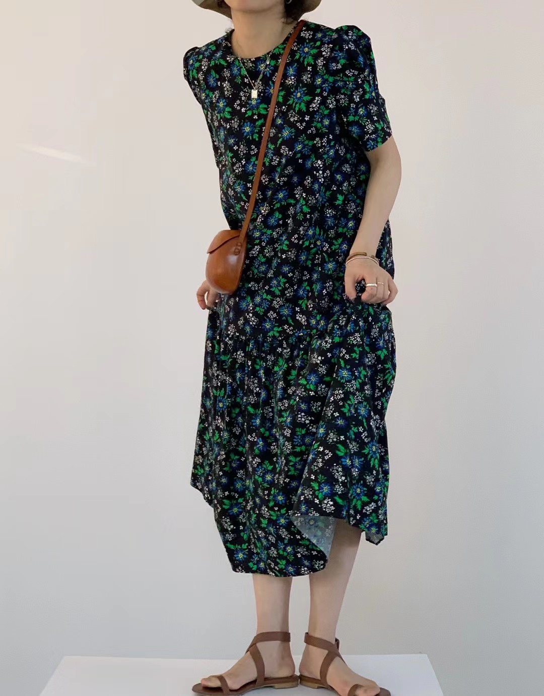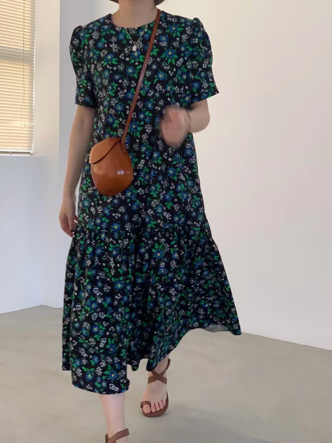 复古的蕾丝连衣裙,宽松的版型,穿着舒适自在,优雅的喇叭袖,修饰手臂线条,精美的绣花,丰富衣身结构,上身优雅时尚,气质优雅。