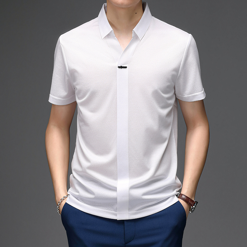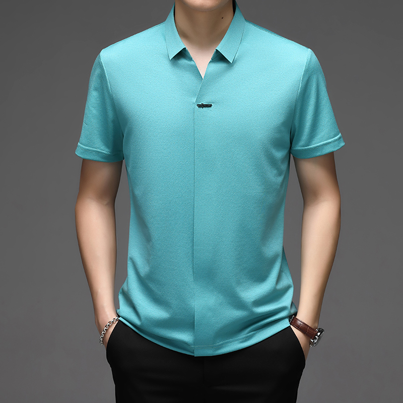 桑蚕丝面料,舒适又透气,短袖设计,修饰手臂线条,翻领设计,彰显男士魅力,宽松t恤,让你轻松驾驭。
