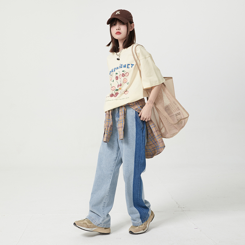 高腰设计,拉长身材比例。高腰牛仔裤,显瘦显腿长。直筒裤型,修饰腿部线条。