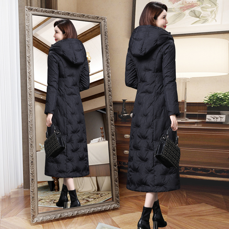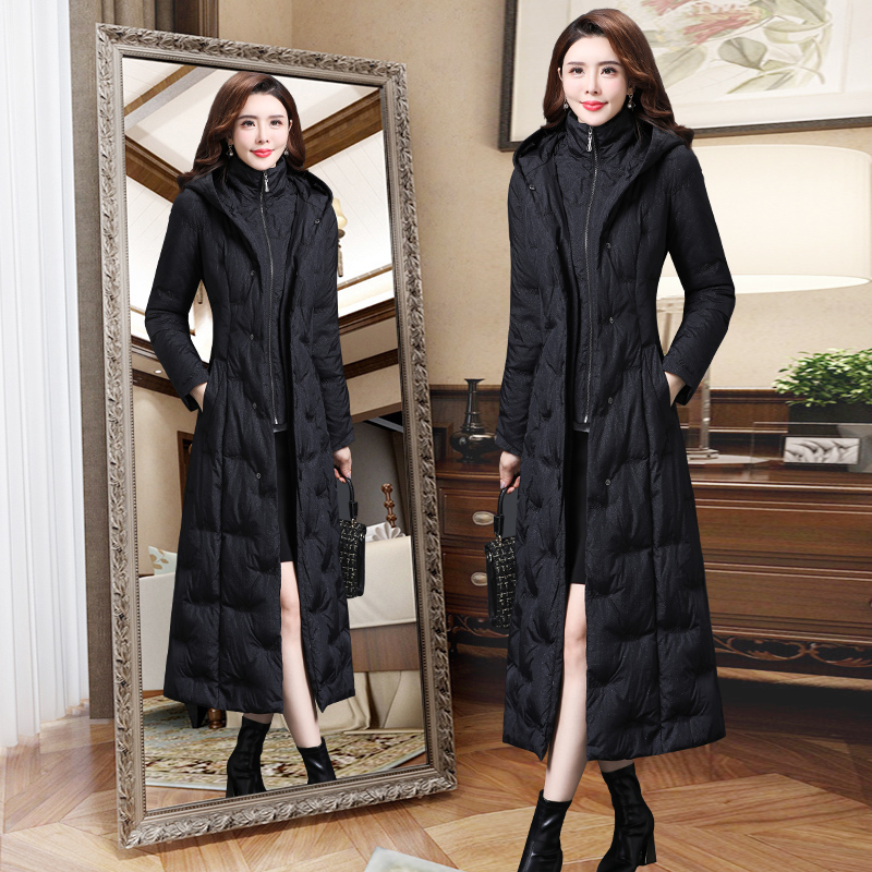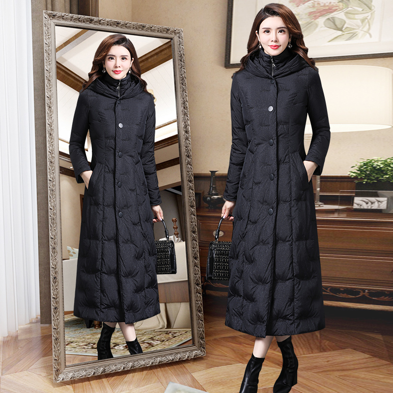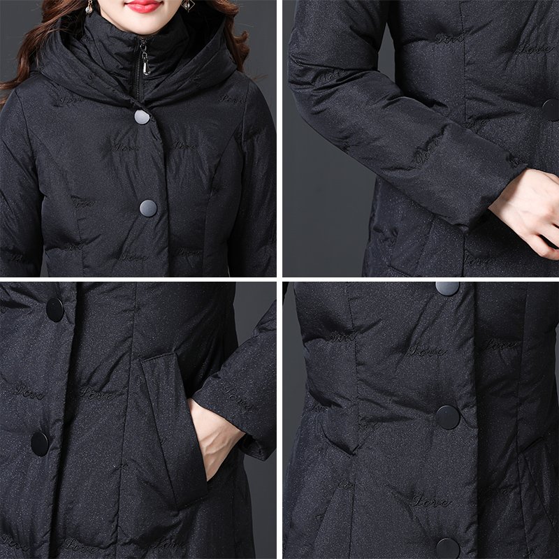 中长款羽绒服,保暖舒适,收腰设计,凸显纤细腰身,连帽设计,防风保暖性好。