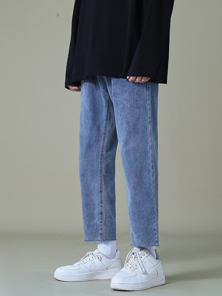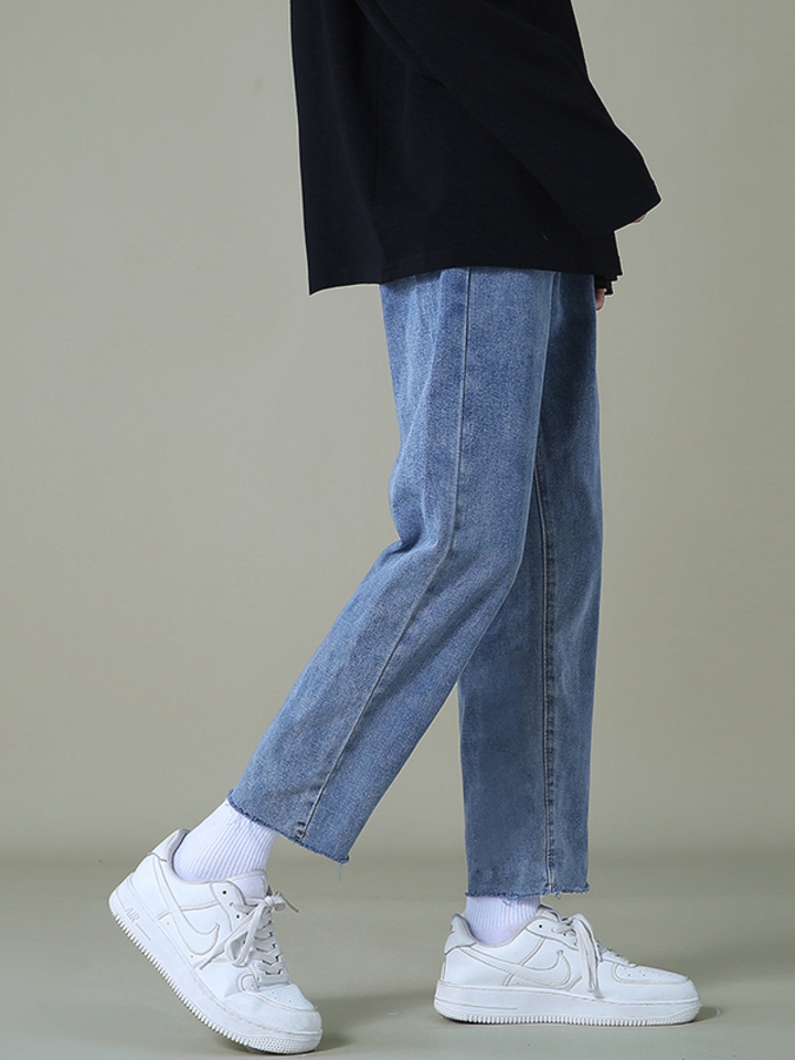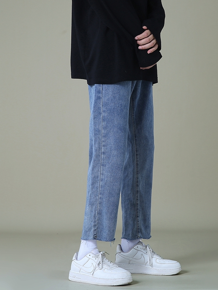 高腰设计,拉长身材比例。高腰牛仔裤,显瘦显腿长。直筒裤型,修饰腿部线条。