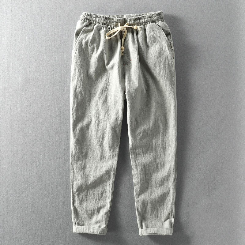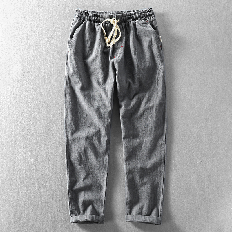 棉麻材质,穿着舒适透气,绅士风格,彰显男士魅力,纯色的色调,简约又百搭,直筒裤型,修饰腿部线条。