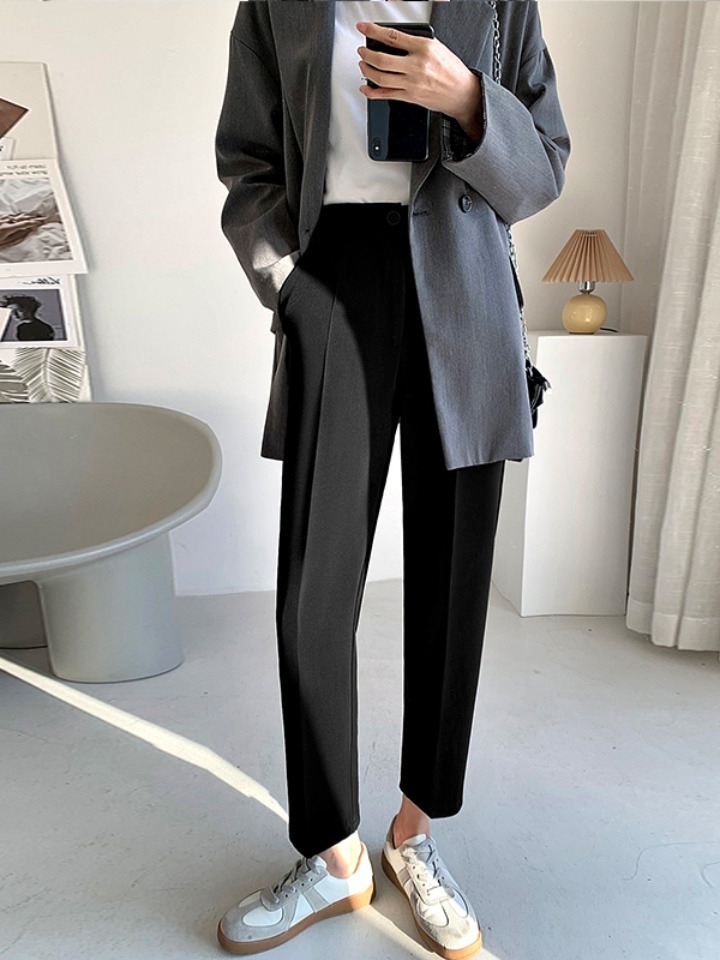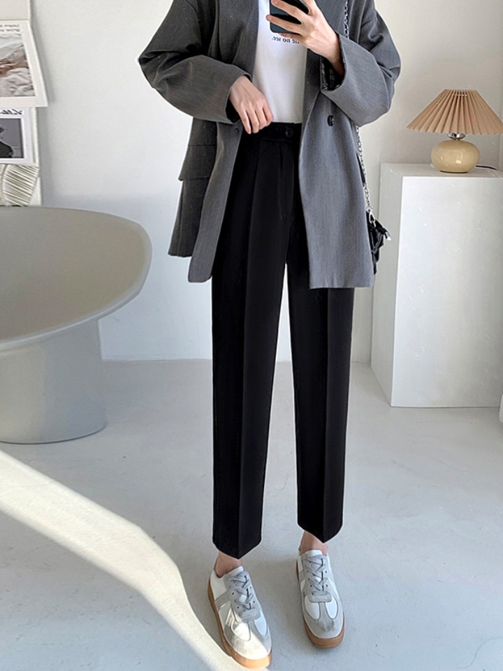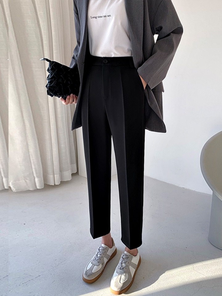 九分款的西裤,介于休闲与正式间,可以通勤也可日常穿着,让纯色的裤身不会有死板感。裤身前幅的经线装饰。