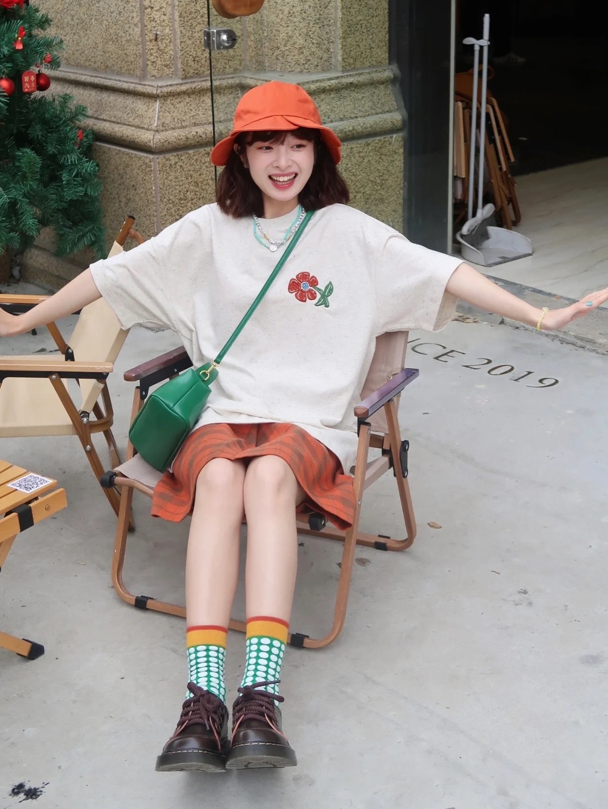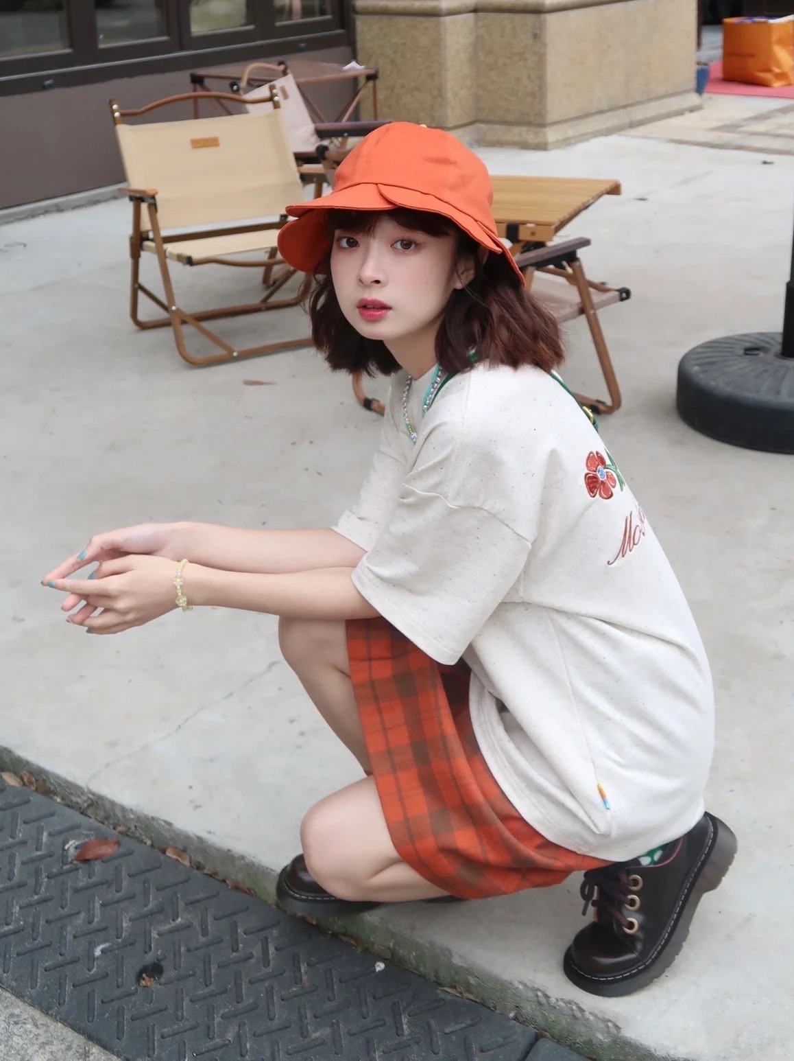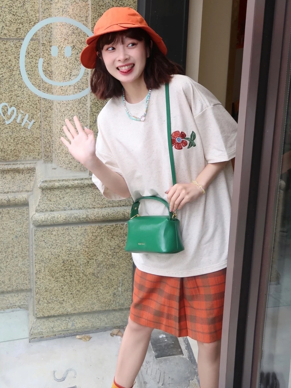 米白色宽松落肩袖舒适穿棉短袖T恤,胸口一多可爱的刺绣小花花更显可爱,下身搭配一条橘红色格纹短裤,带上同色系渔夫帽,搭配一双撞色中筒袜,穿上一双深卡其系带平底鞋,再背上一只斜跨吸睛绿色小包包,洋溢着青春活力出街吧!