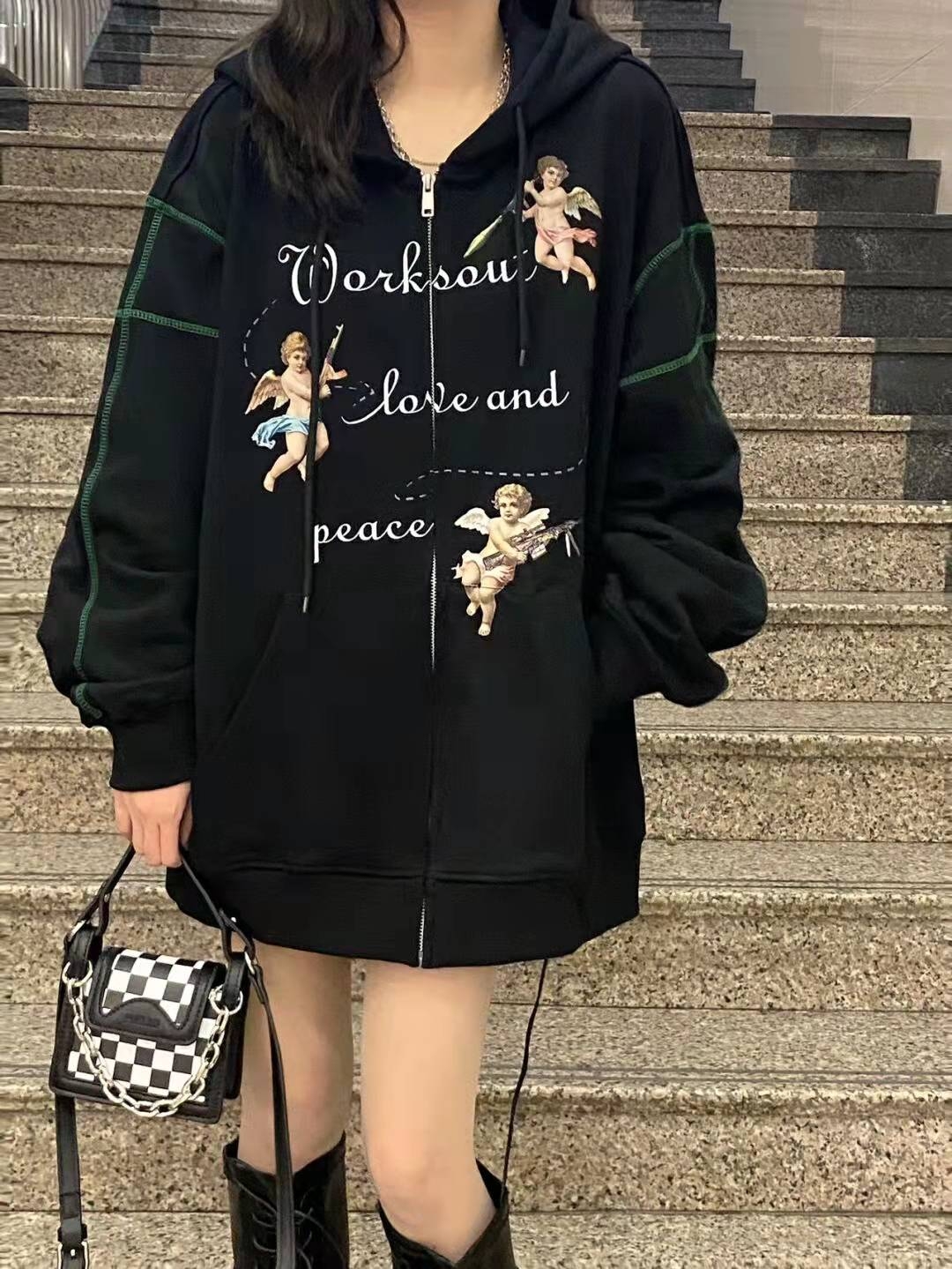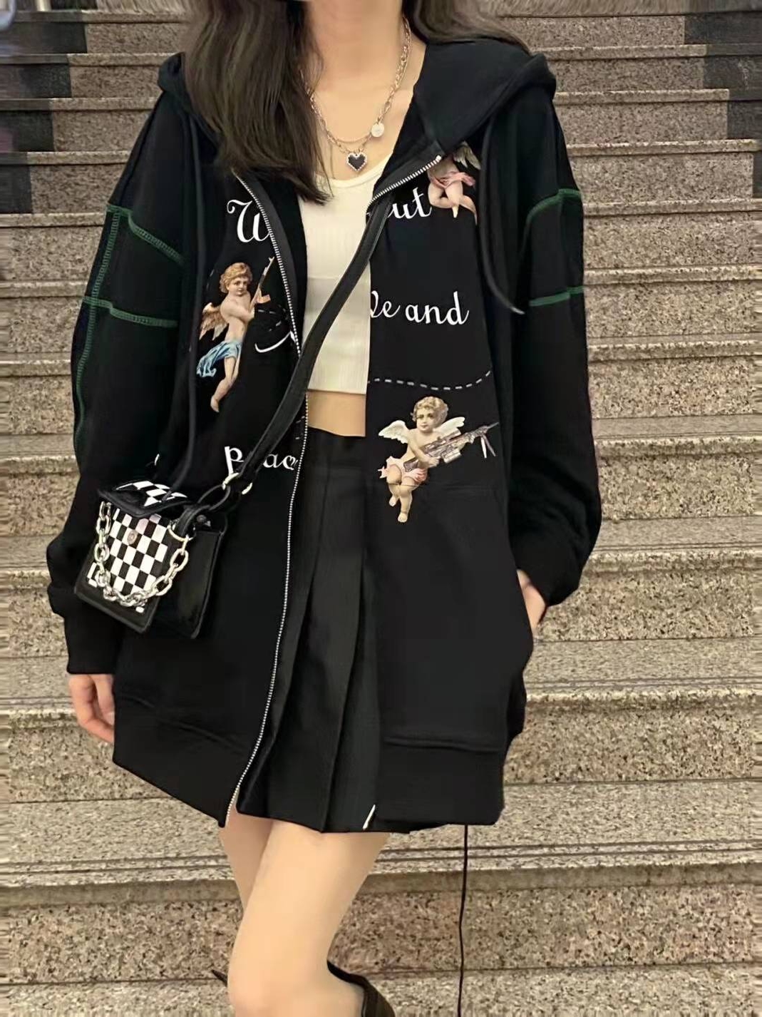 春秋的天气还是有的微凉,配件薄款外套正合适,黑色的卫衣外套,很宽松,独特的设计, 一眼看中的外套,小天使图案太可爱了。