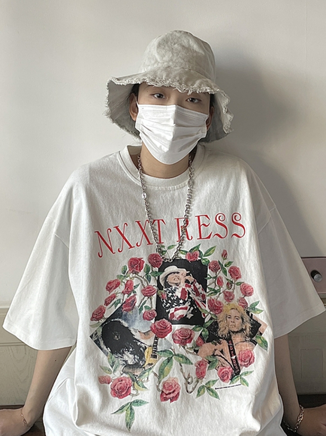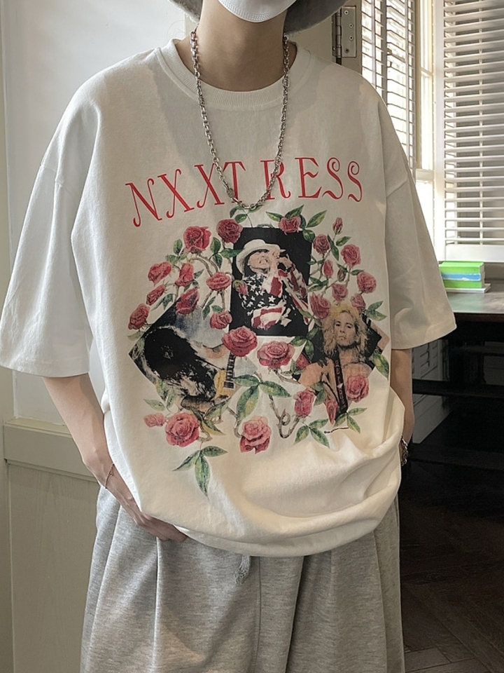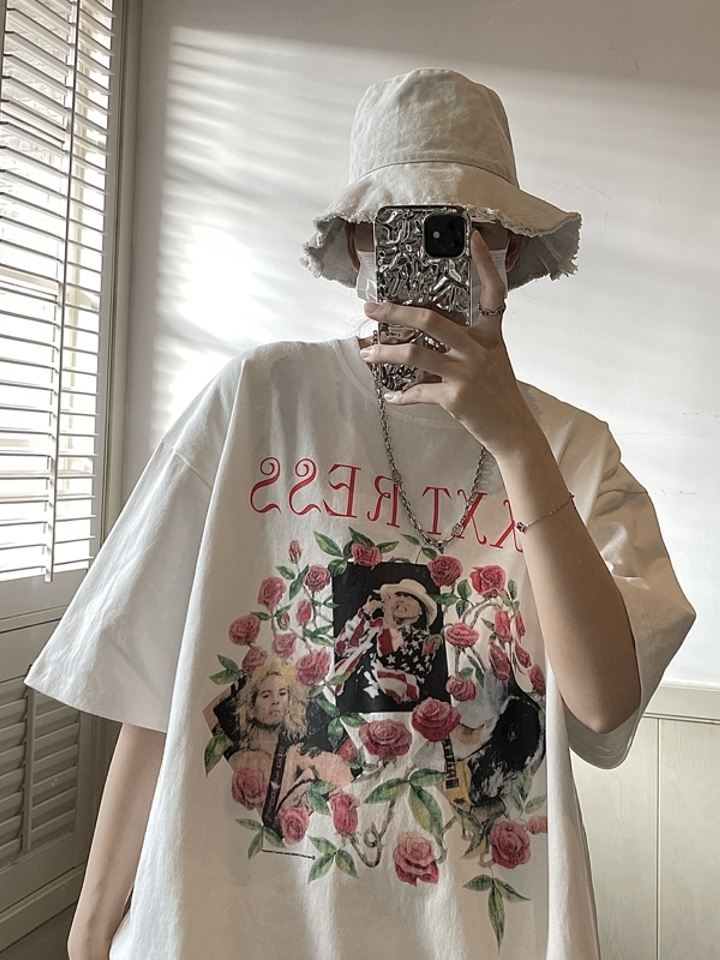 这款短袖T恤采用经典圆领套头设计,罗纹领口百搭又不易变形;前面玫瑰油画图案配以字母设计,丰富了整体视觉,散发着青春阳光气息。