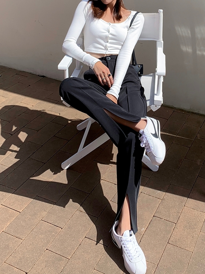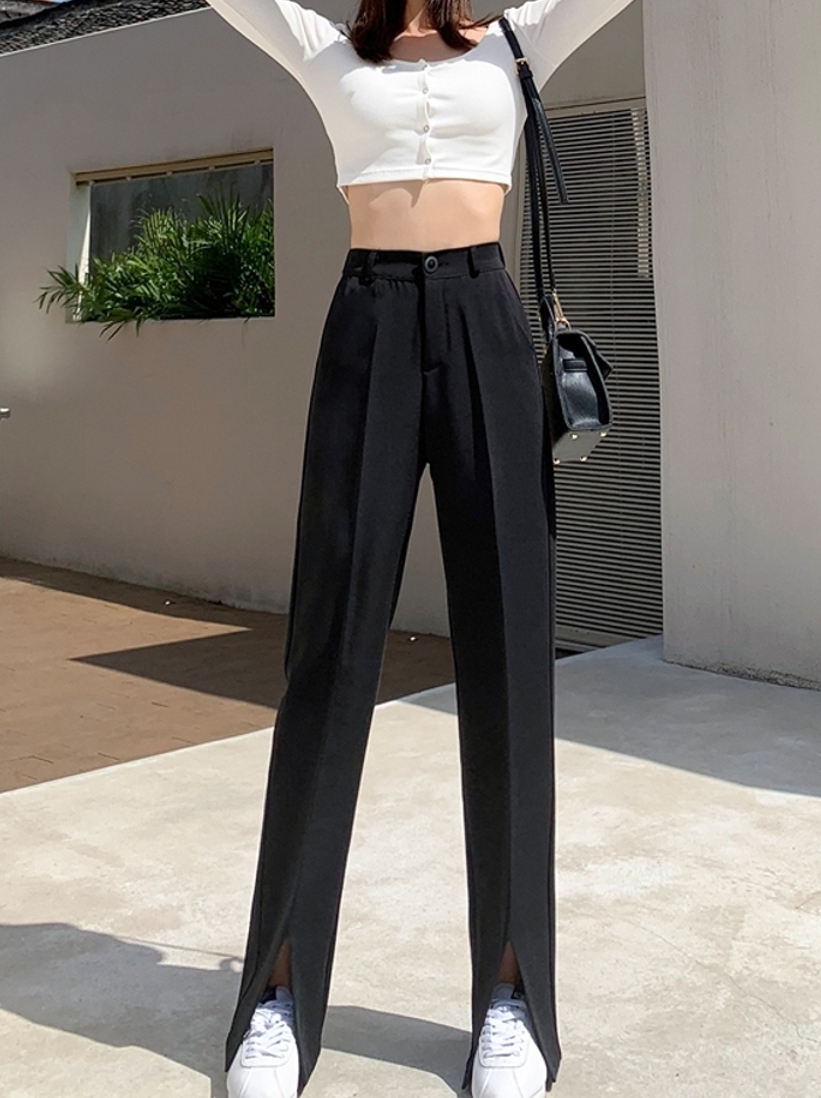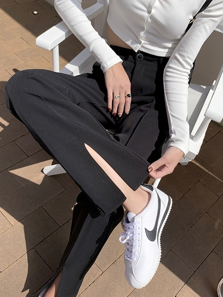 高腰的设计,起到收腹提臀效果,勾勒出凹凸有致迷人身材,微喇裤型,裤脚做开叉处理,修饰小脚线条,同时也能增添女人的性感魅力。