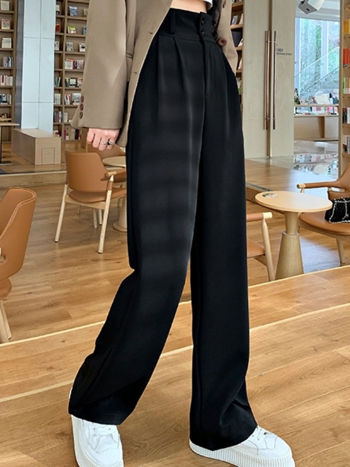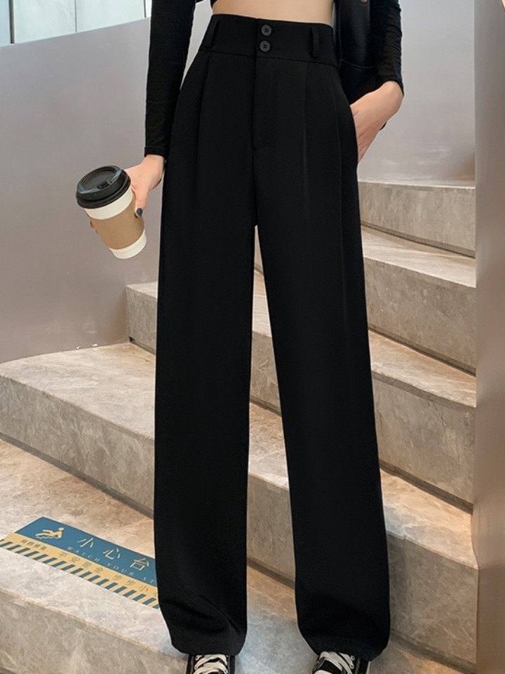 一款黑色直筒的阔腿裤,休闲帅气显瘦,使得裤子更加具有垂坠感,视觉上还能将双腿衬托得更加纤细修长。