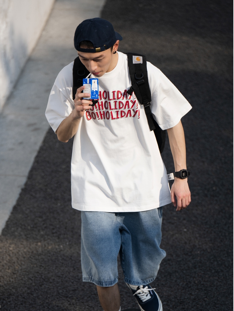 这款简约的T恤圆领的设计,简单时尚,胸前布达佩斯印花设计,很有潮味,宽松的版型设计,搭配牛仔短裤,简约时尚。
