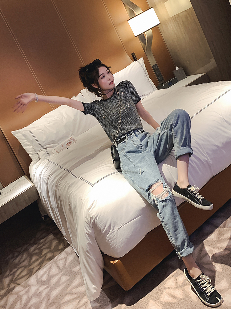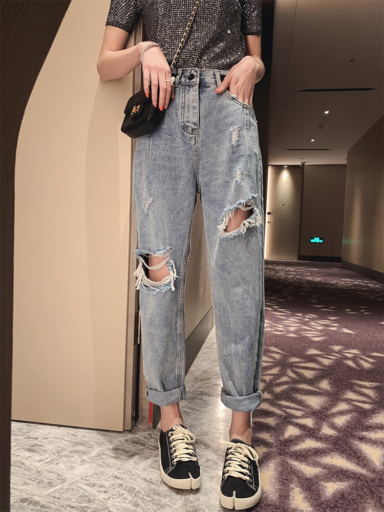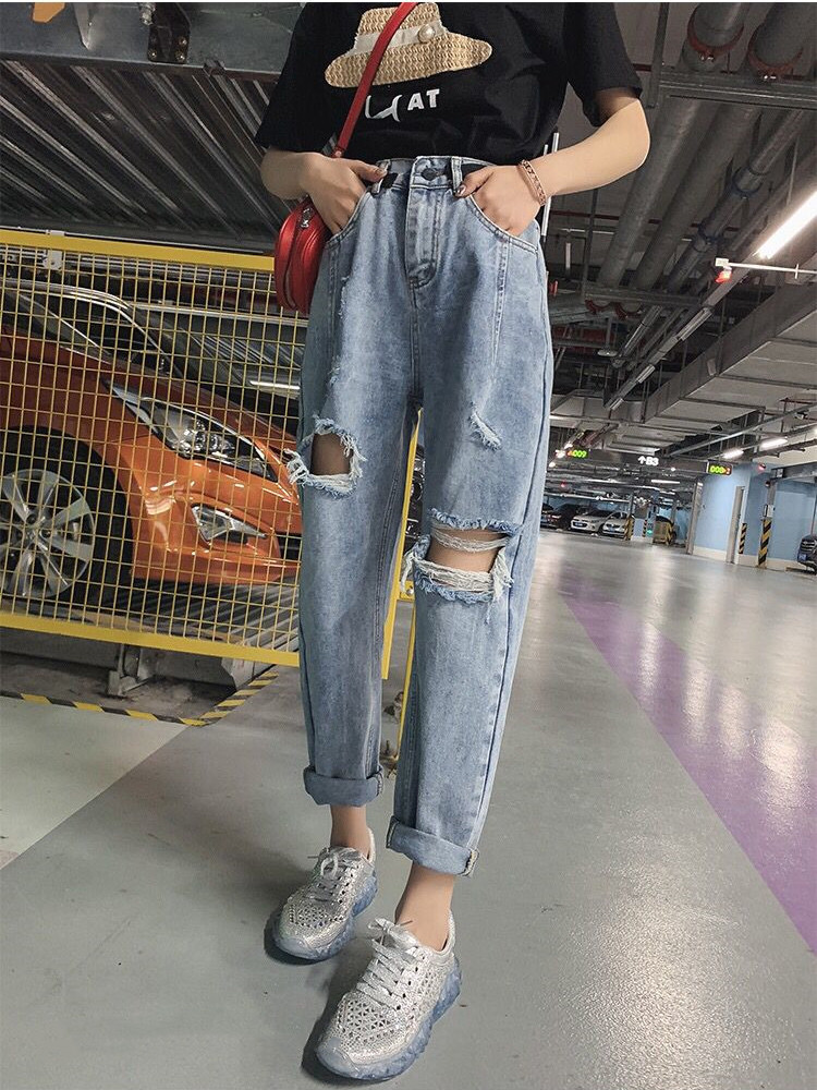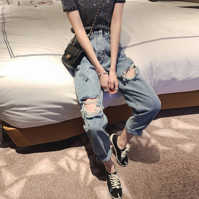 高腰设计,拉长身材比例。高腰牛仔裤,显瘦显腿长。直筒裤型,修饰腿部线条。