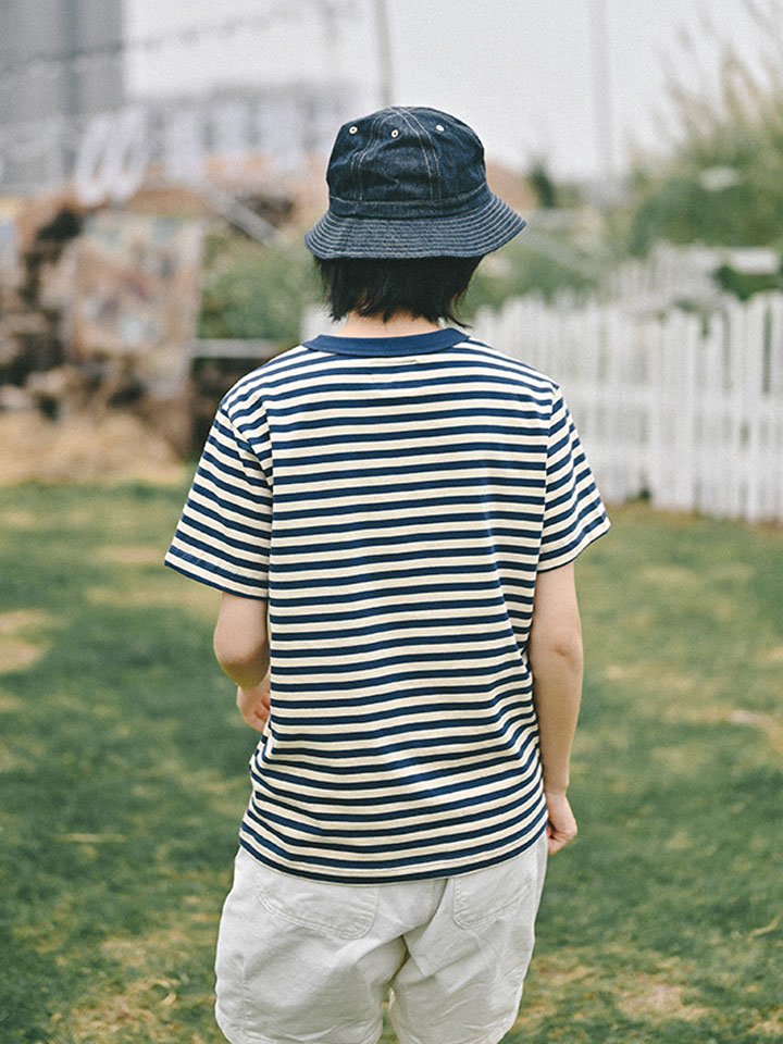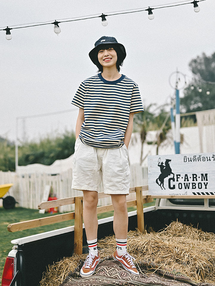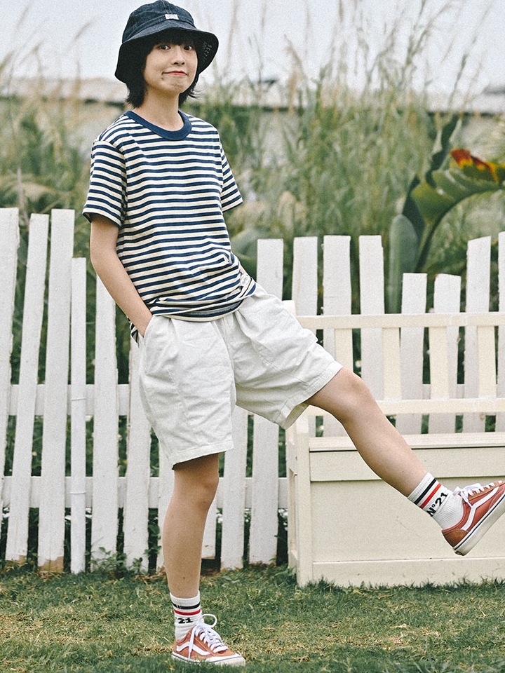 日系小清新的短袖,搭配一条工装裤,上身好有复古的感觉,再戴上一顶黑色渔夫帽,让你行走间凸显儒雅气质。