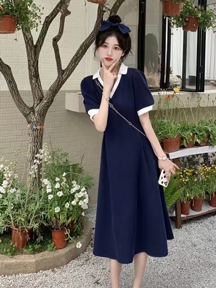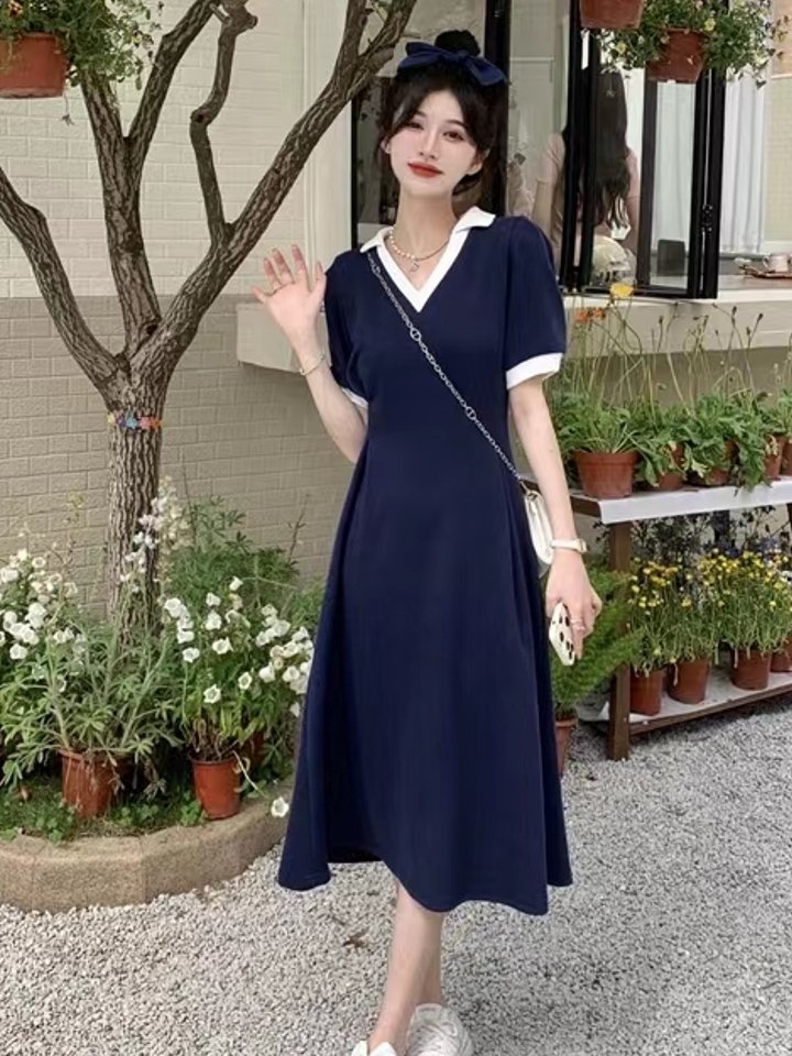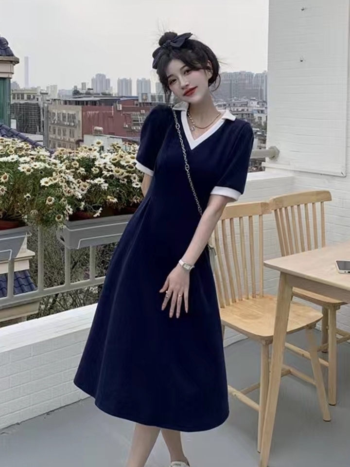 白色的小翻领和白色的袖口撞色拼接在墨蓝色的衣身上,丰富了视觉层次感,具有很是高贵的气质,简约的连衣裙展现知性的女人味。