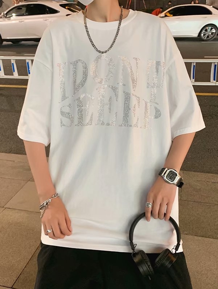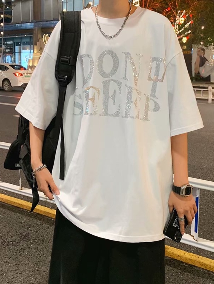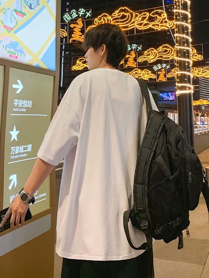 宽松T恤五分袖,版型属于OV风格,很拉风,夏天穿起来是非常的舒服,透风又很潮,搭配上胸前字母印花元素,很火爆的风格,帅气LOOK,相当的给力哦。真的是魅力男搭配,很好冲哦