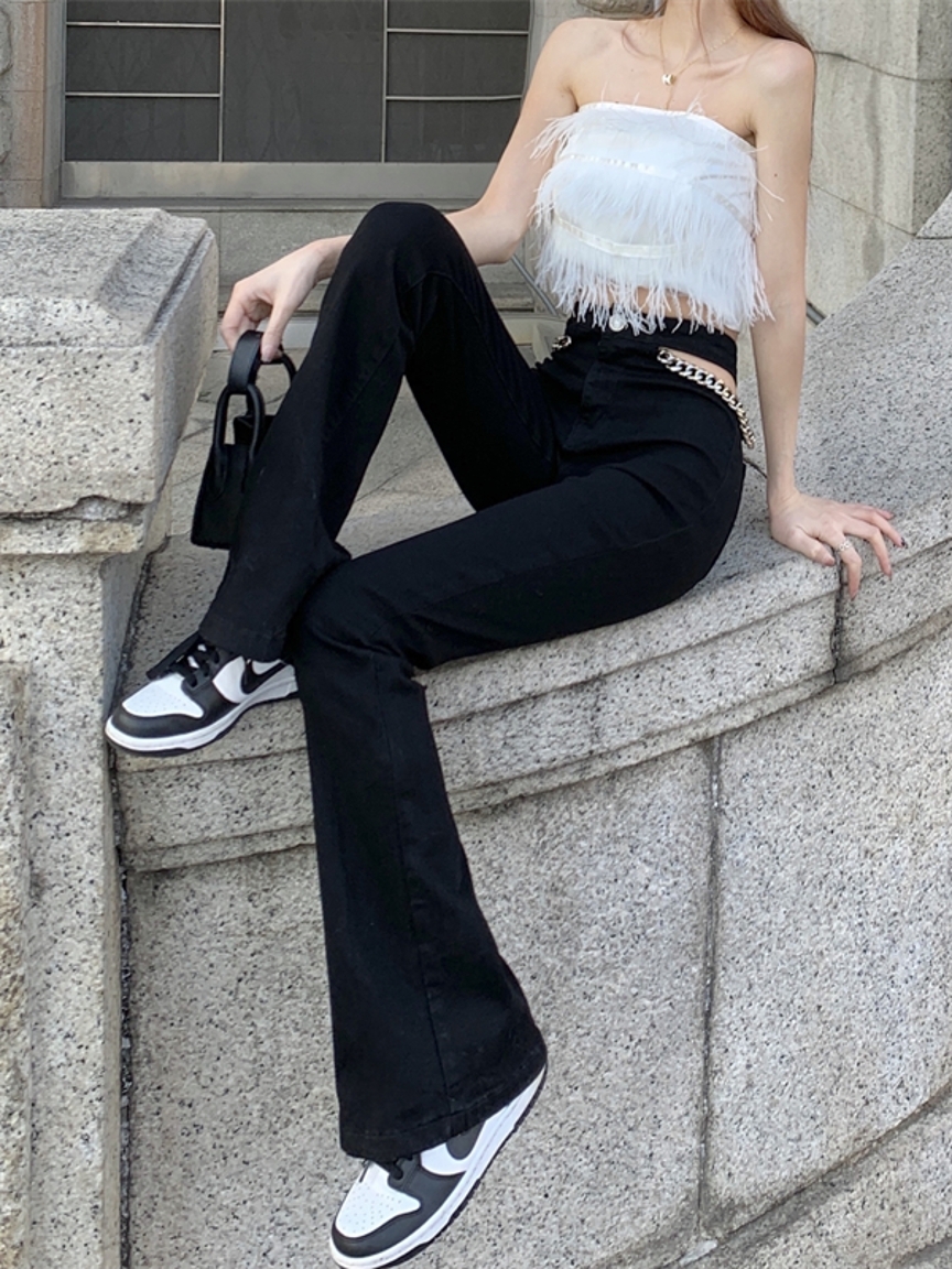 高腰的设计,拉长腿部线条,显瘦效果很好,高腰的版型,很显高挑,修身的剪裁,修饰腿部曲线,上身很有范。
