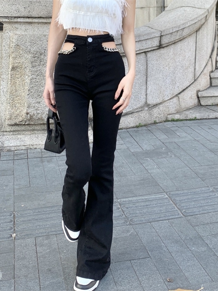 这款牛仔裤的设计很有特色,高腰的版型,很好的修饰了身材比例,显瘦效果很棒,搭配一件T恤,就能轻松穿出时尚感。
