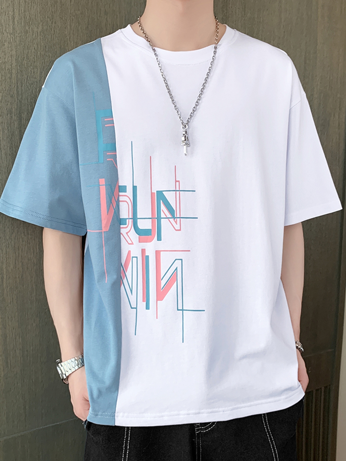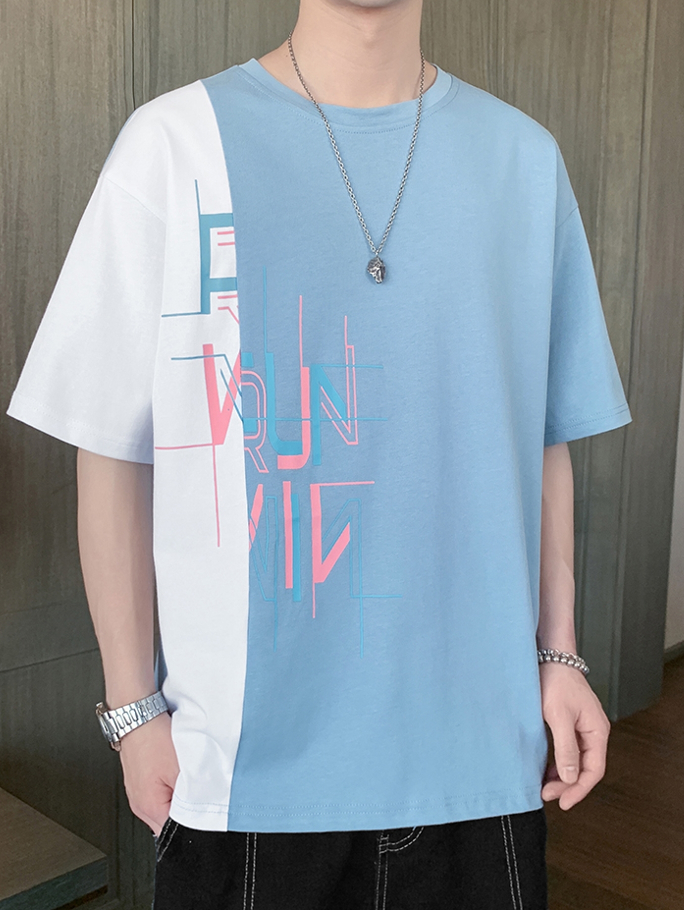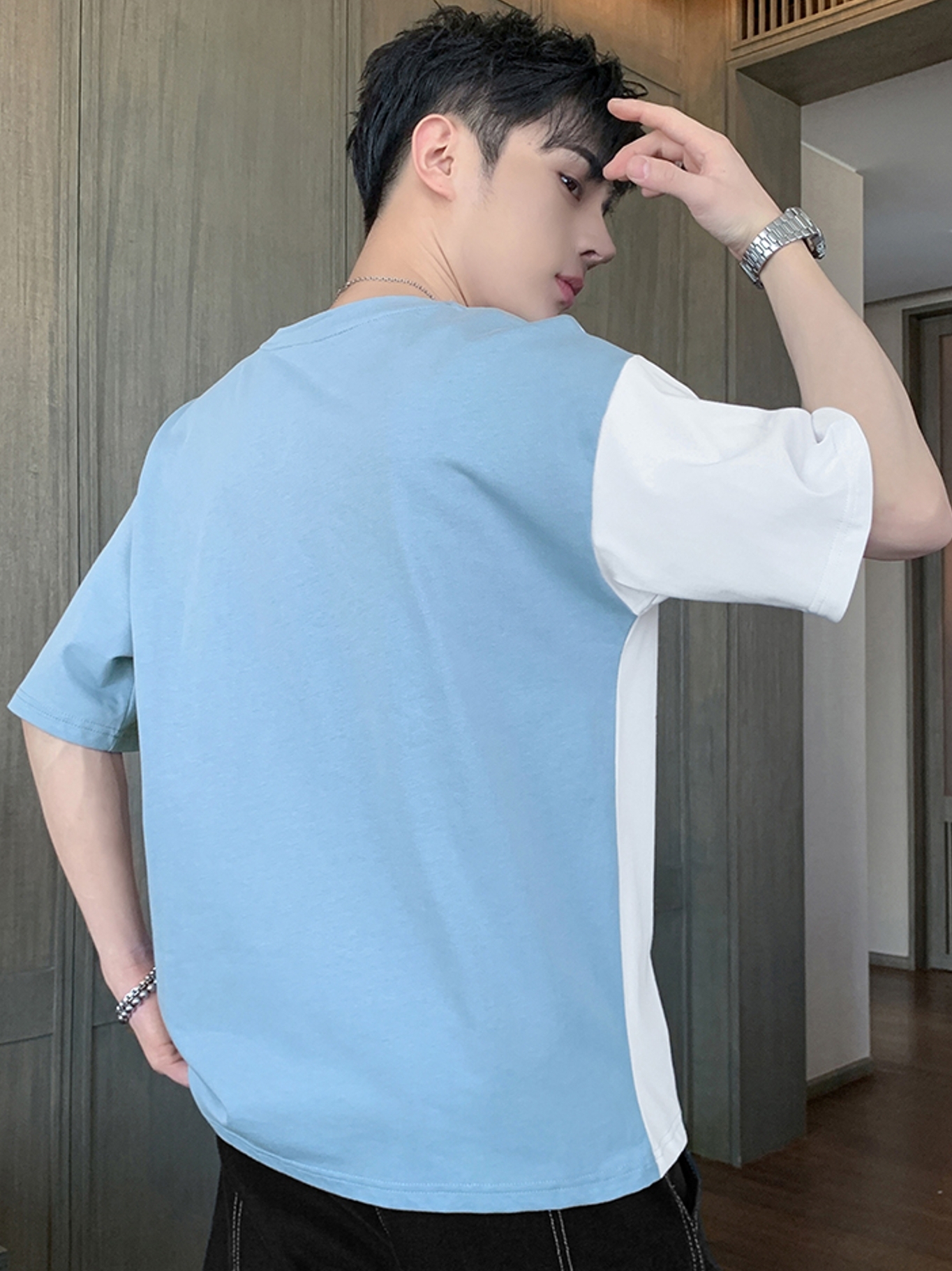 蓝白拼接有种简单的帅气。简简单单五分袖T恤,宽松的版型搭配纯色五分袖,穿上身超级舒适,能很好的遮掩身材的不足。