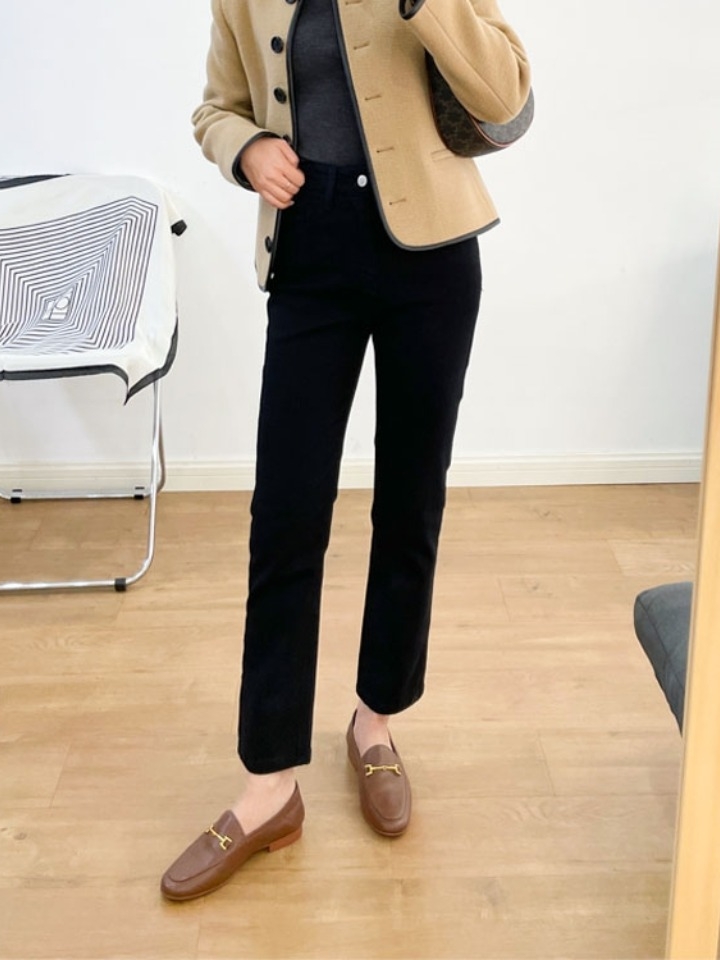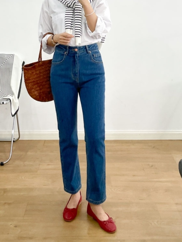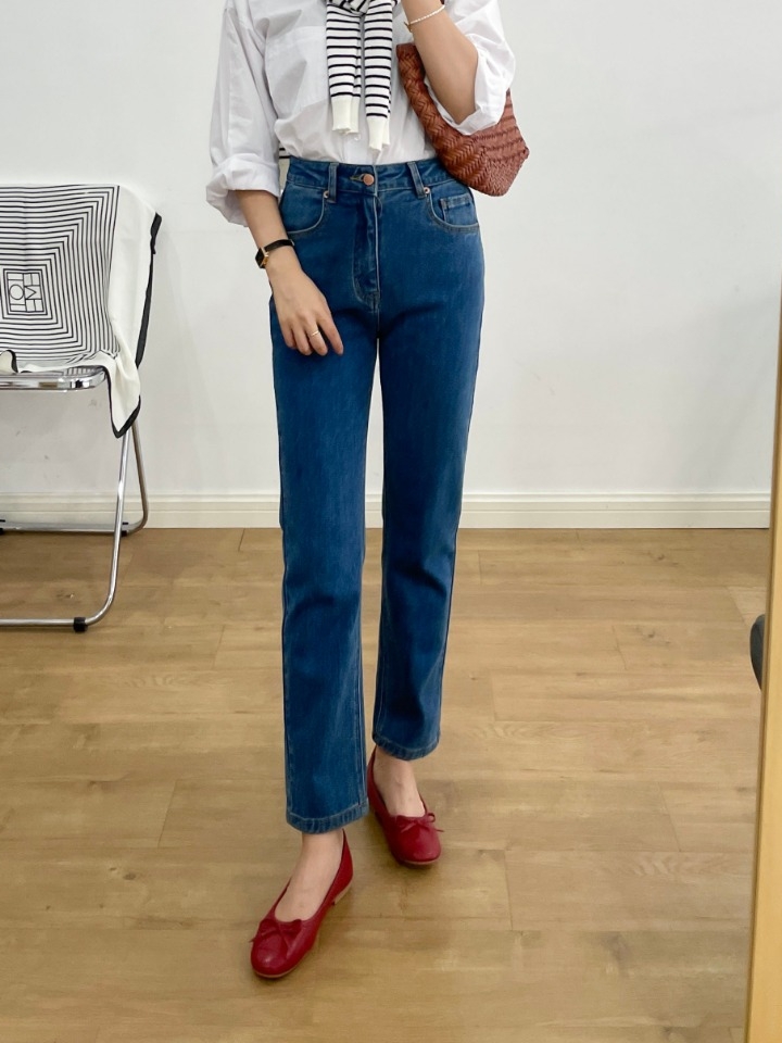 高腰设计,拉长身材比例。高腰牛仔裤,显瘦显腿长。直筒裤型,修饰腿部线条。