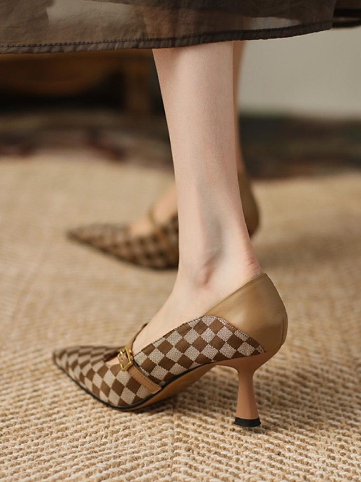 优雅时尚的尖头设计,彰显时尚的魅力,衬托双足的纤细感。鞋面棋盘格的图案,更显独特。性感细高跟,满足人体工程学设计,拉长腿部曲线,修长的尖头,上脚显瘦性感,配上细高跟,拔高身材提升自信魅力