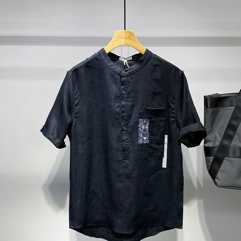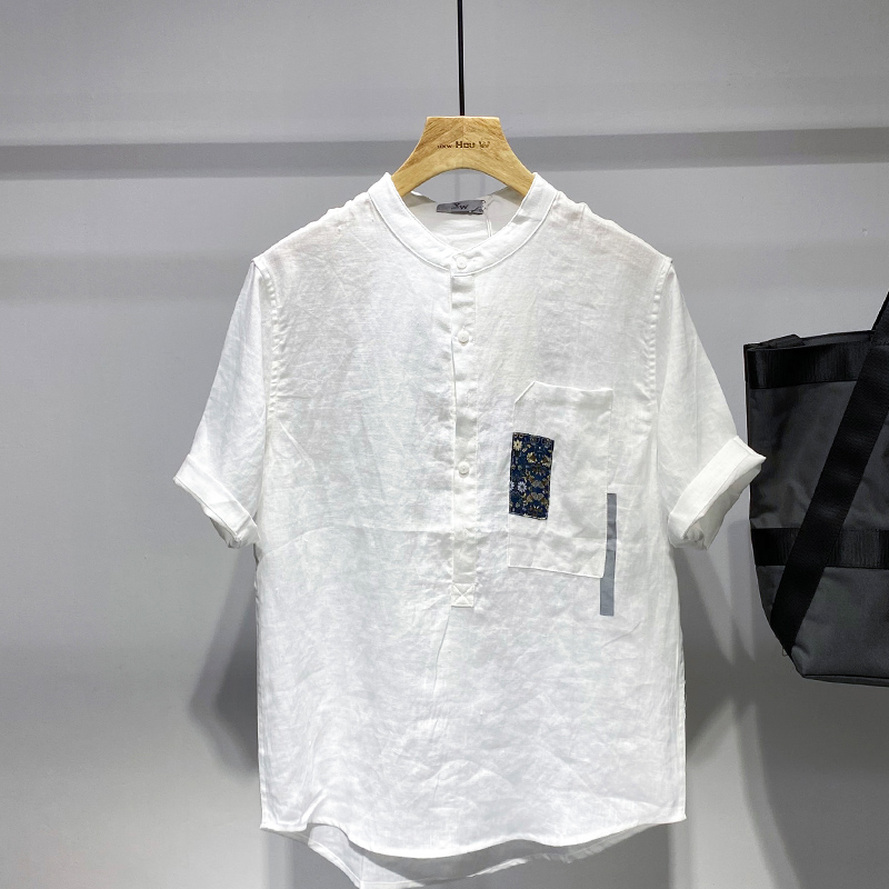 亚麻材质,穿着舒适透气,衬衣版型,修饰身材曲线,简约的款式,时尚又百搭,短袖设计,修饰手臂线条,翻领设计,彰显绅士气质。