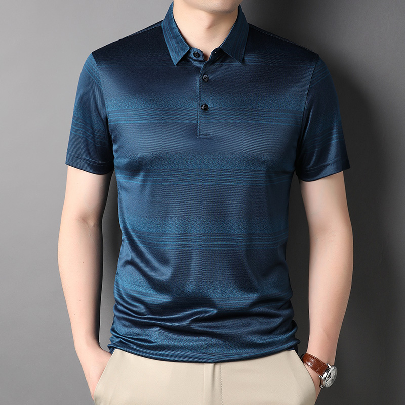 翻领设计,彰显男士魅力,经典polo衫版型设计,修身版型,穿着舒适自在,短袖设计,修饰手臂线条,桑蚕丝面料,舒适又透气。