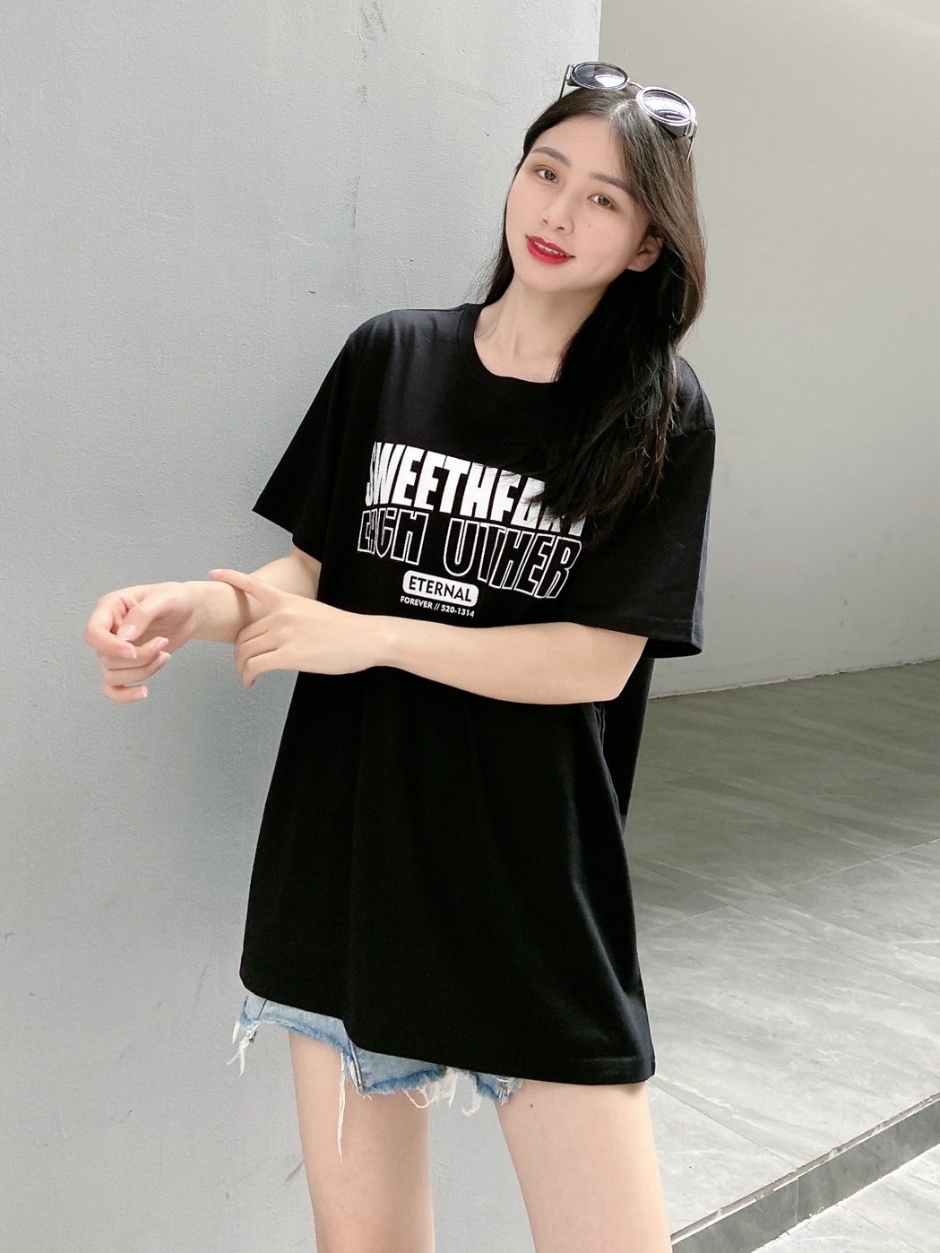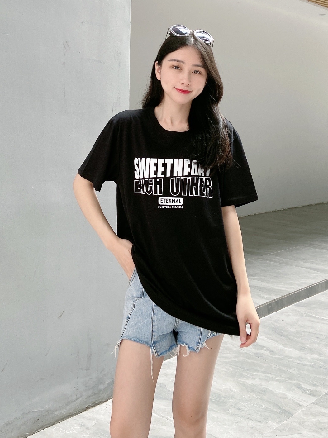 这款t恤是简约的风格,宽松的版型,时尚百搭,胸前的字母印花,很有个性,搭配牛仔裤或者短裤都很好看。
