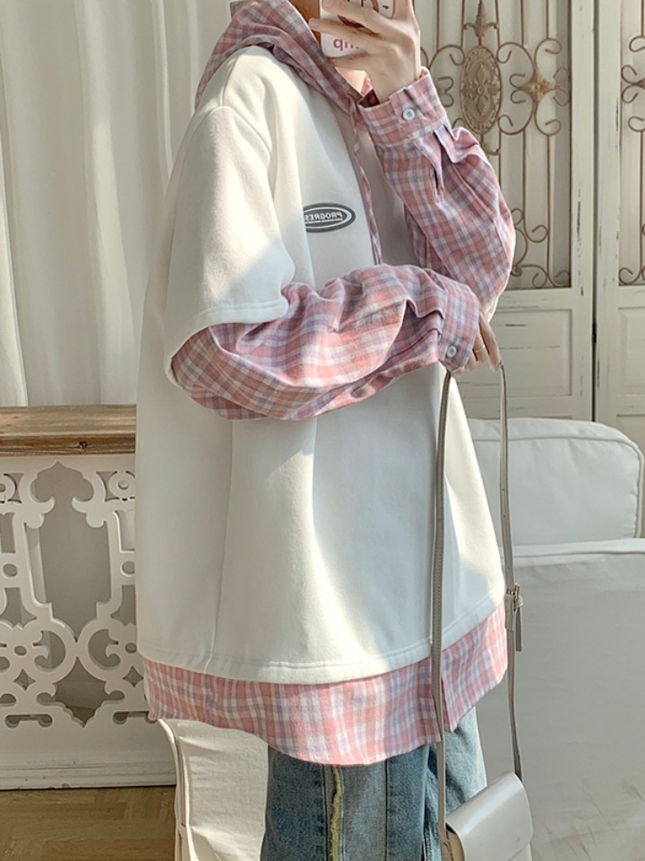 假两件的一款卫衣,能够打造出层次穿搭。采用衬衫的衣领,经典的格子元素,属于看不腻的类型。不规则的衣摆,加上两边开叉设计,衣服很有设计感,能穿出时尚气息。可以微微卷起衣袖,很有休闲的味道。