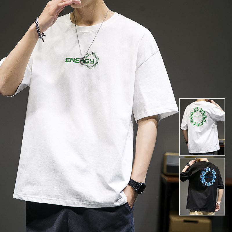 纯棉材质,穿着舒适透气,胸前印花设计,个性时尚,经典圆领设计,简约大方,短袖设计,修饰手臂线条。