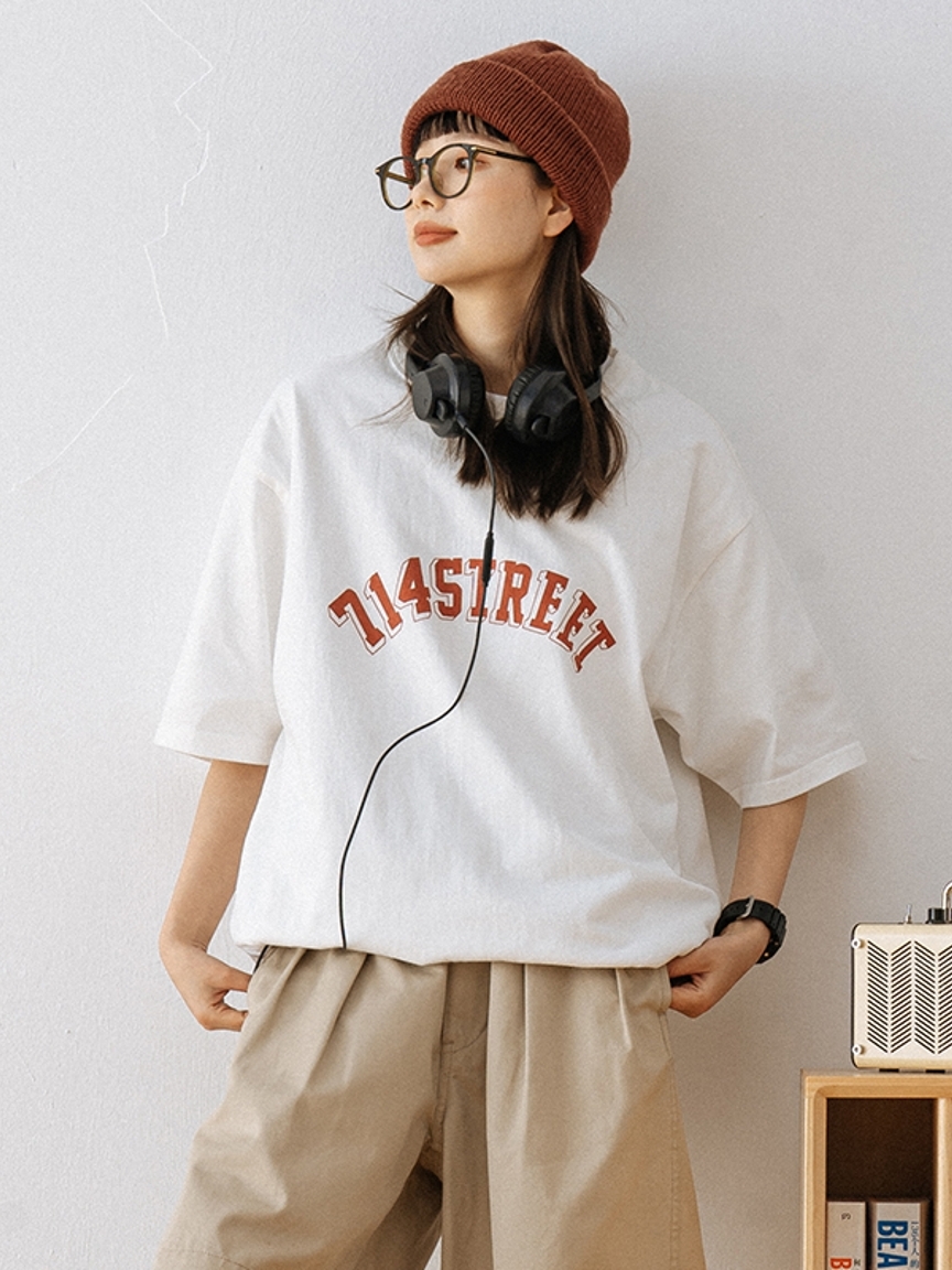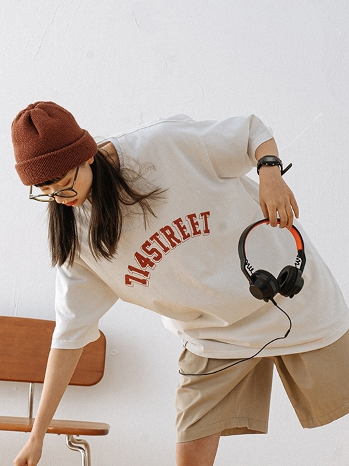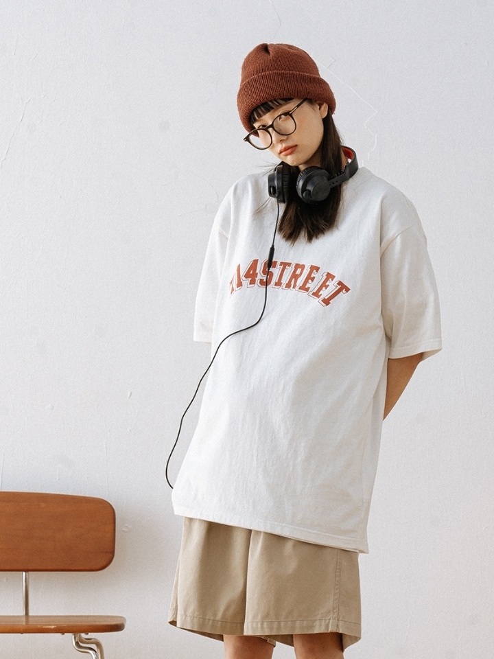 胸前用经典复古的logo字体点缀,结合复古的配色,营造出日系舒适的感觉,同时也打破纯色T恤的单调感。