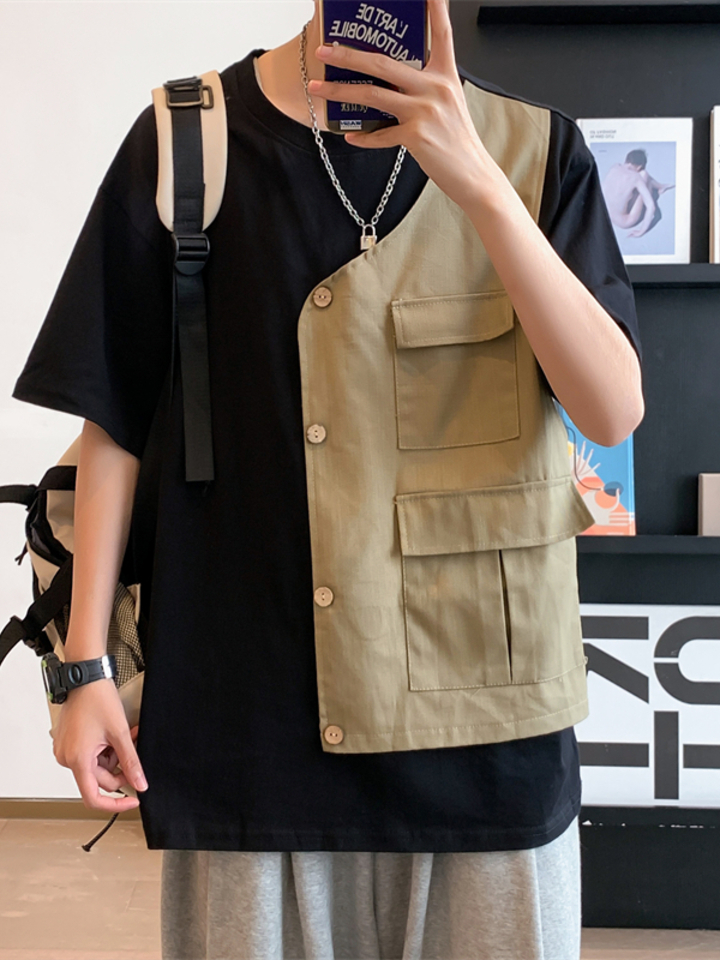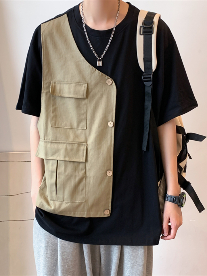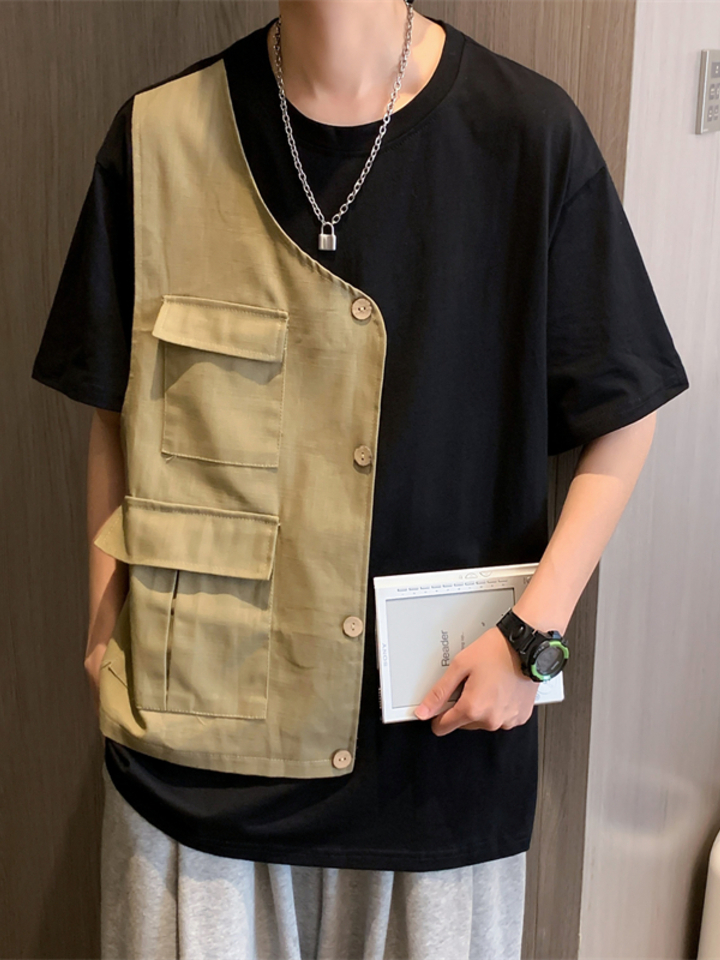 假两件的创意设计让单调的短袖T恤拥有了难得的层次感,工装款搭配简单的T恤设计,潮流感满满。