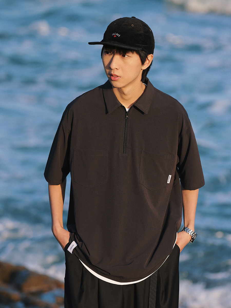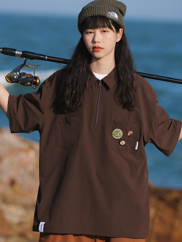 时尚衬衫领,领口是拉链,肩部走线均匀,牢固版型,袖口低调时尚,精致门襟,胸前的口袋与领子招呼相应。