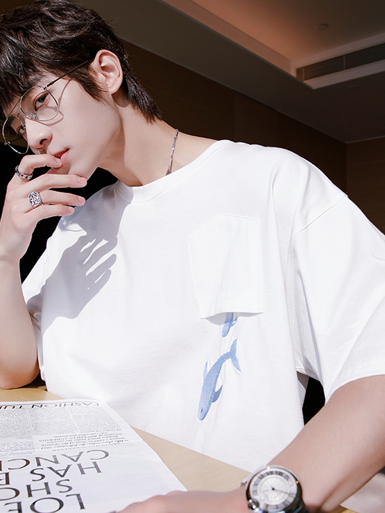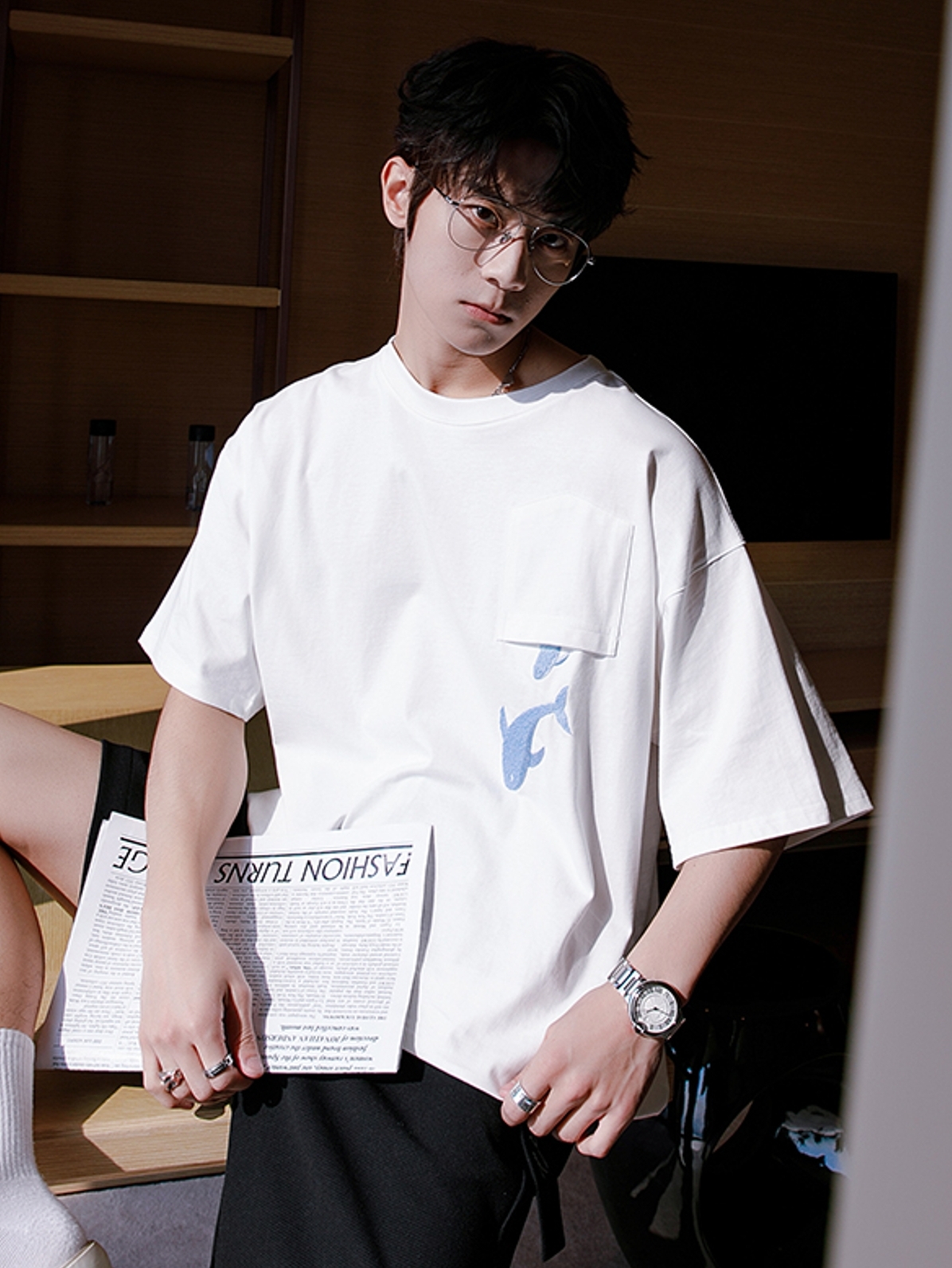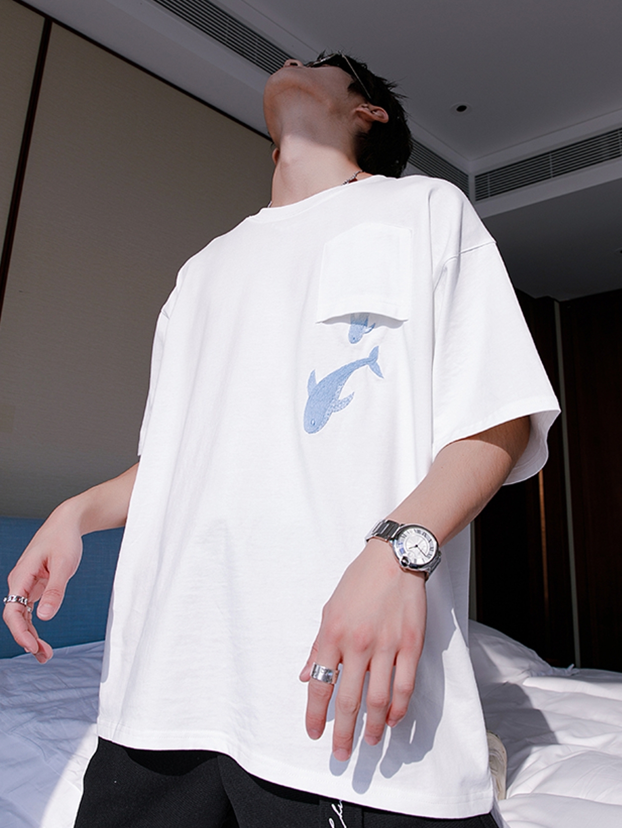 非常养眼的浅纯色外表,释放出清爽夏日的风情,大方又干净,胸前的鲸鱼印花,更加吸引人带利落有型的上身效果。