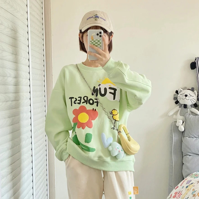 圆领套头设计,方便穿脱,简约的款式,时尚又百搭,宽松卫衣,让你轻松驾驭,马卡龙印花,少女感十足。