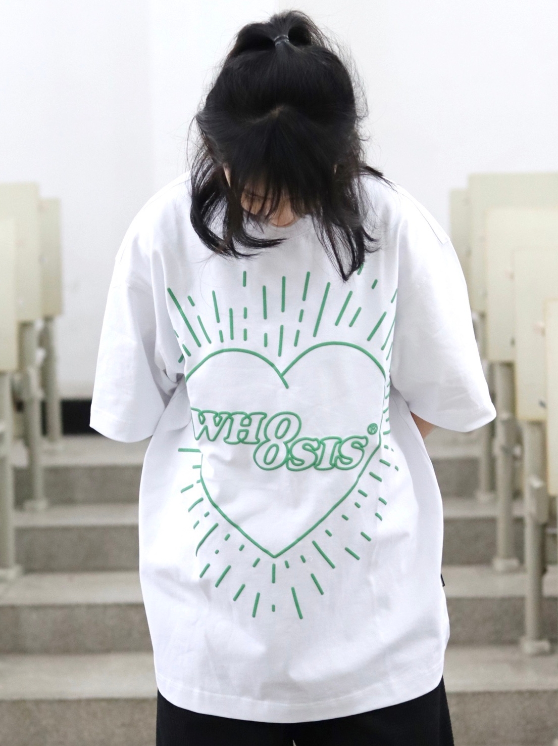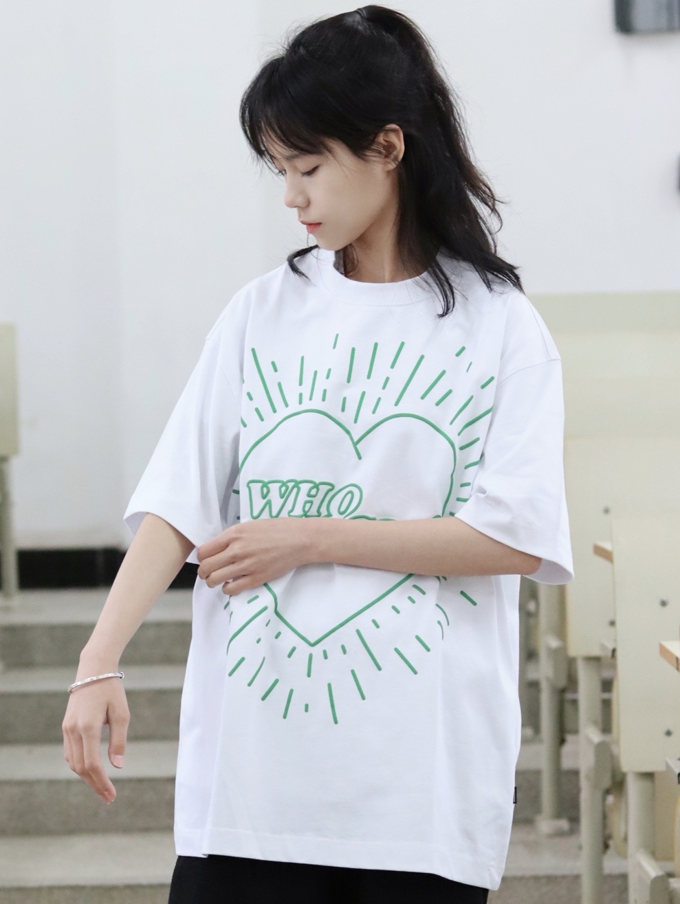 在宽松白色的T恤上,印着很个性的英文字母和桃心,看着非常的潮流,我穿一件黑色的长裤搭配,简单又利落,很休闲哦。