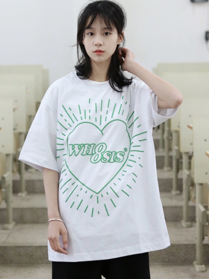 这是一款设计很与众不同的短袖t恤,我要用它出门凹造型。胸前的爱心印花大大提升了t恤的颜值。落肩的袖型柔美又慵懒。