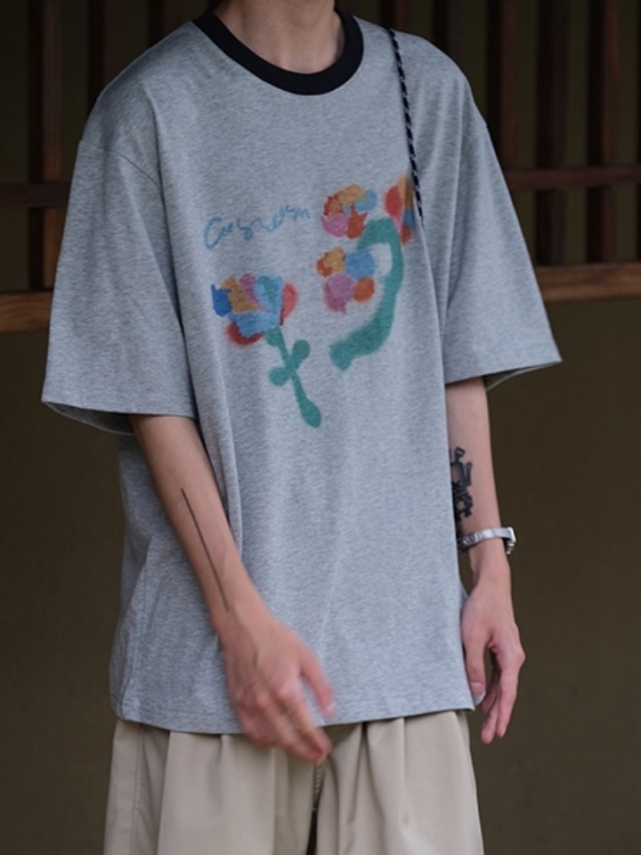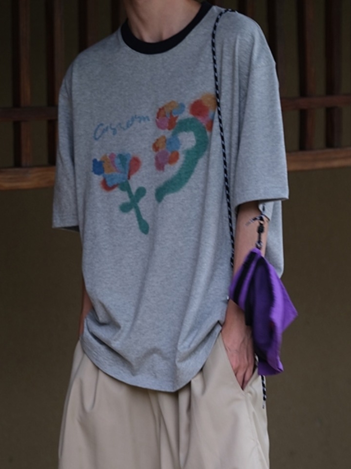 撞色的花卉图案装饰在衣身消除了单调,带出了甜美的气息,略微宽松的版型穿起来舒适休闲,也很显帅气。