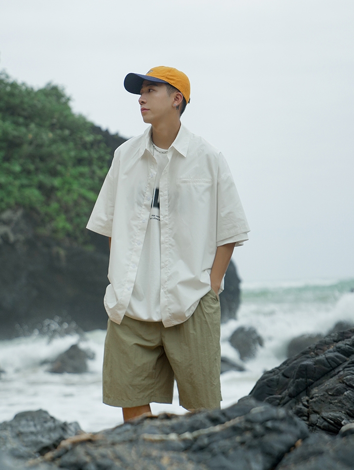 这款简洁又清新的衬衫,在搭配上也是很简单,内搭一件白色T恤,下装五分短裤,一双老爹鞋,洋溢着年轻人的青春活力。