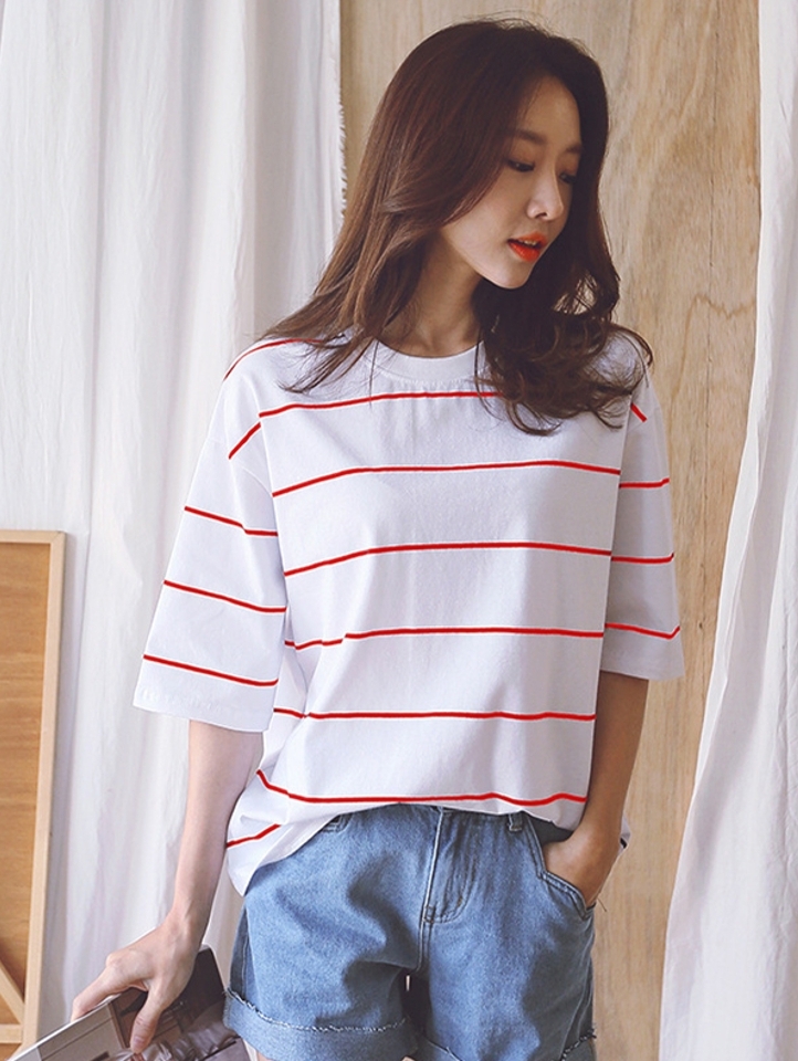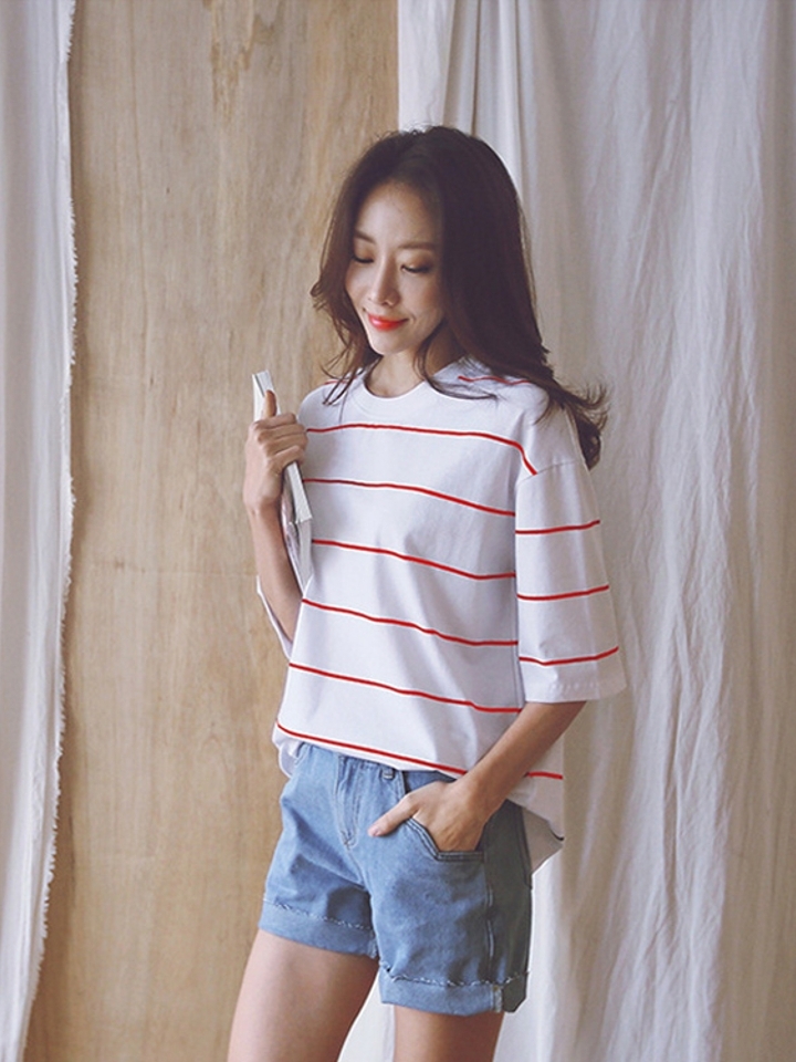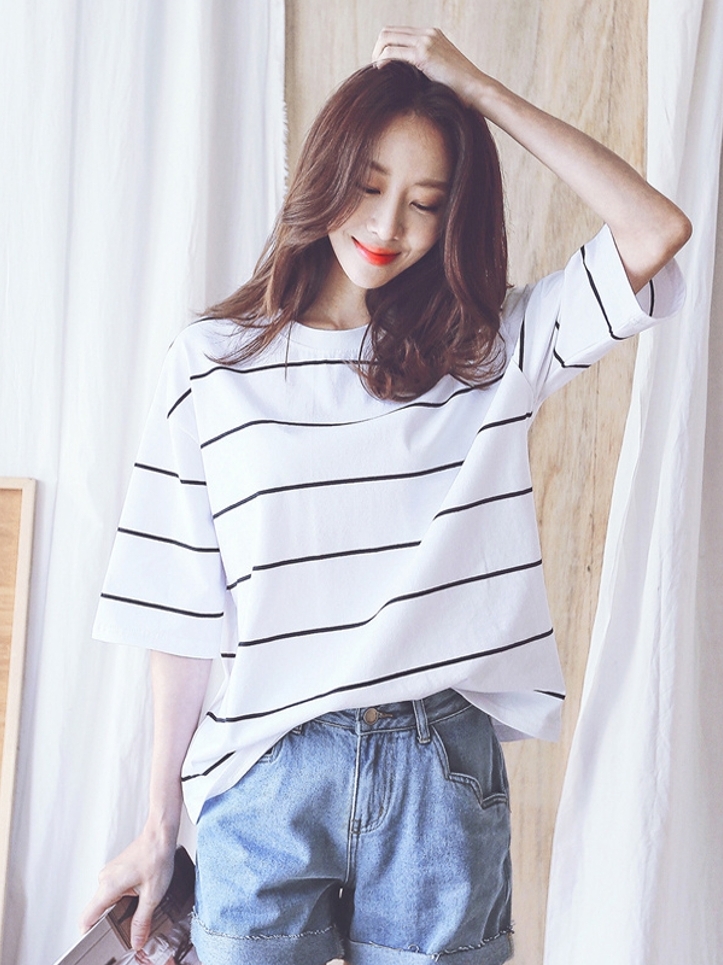 圆领的设计,简单大方,不挑人,条纹的设计元素更是经典,简约不简单~这件条纹T恤无论是打底也好,外穿也不错。