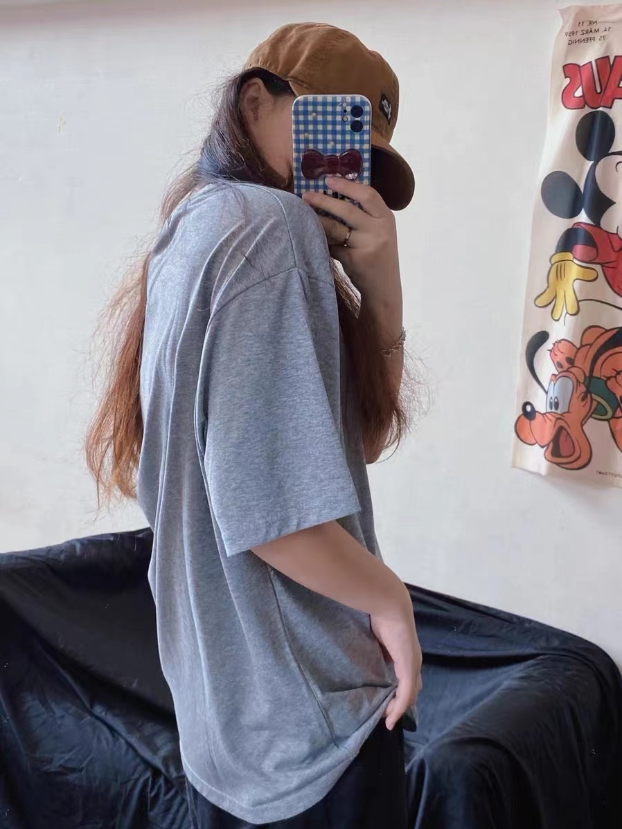 衣服我喜欢oversize风,夏天出街穿宽松一点更舒服。简约的小圆领修饰优美的颈部线条,清爽宜人,我喜欢。